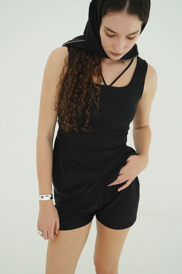 インナーパンツ付きのショートパンツとのセットで、安心感と動きやすさを両立。アクティブな動きにも対応します。