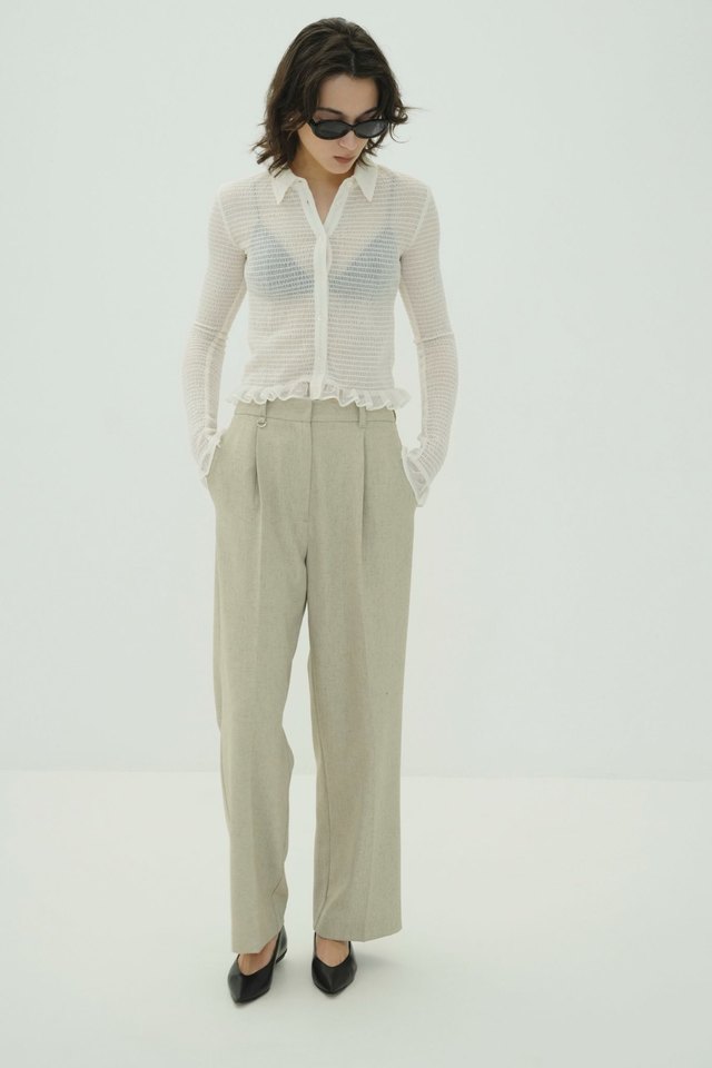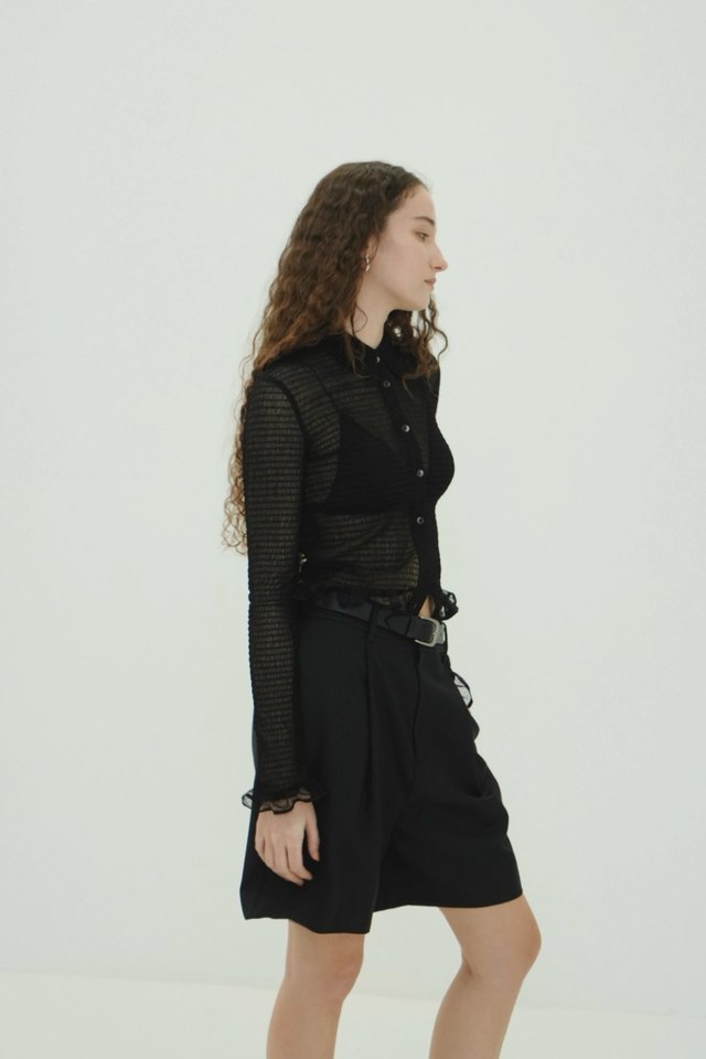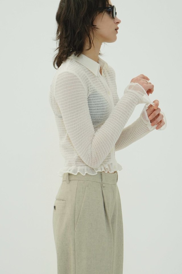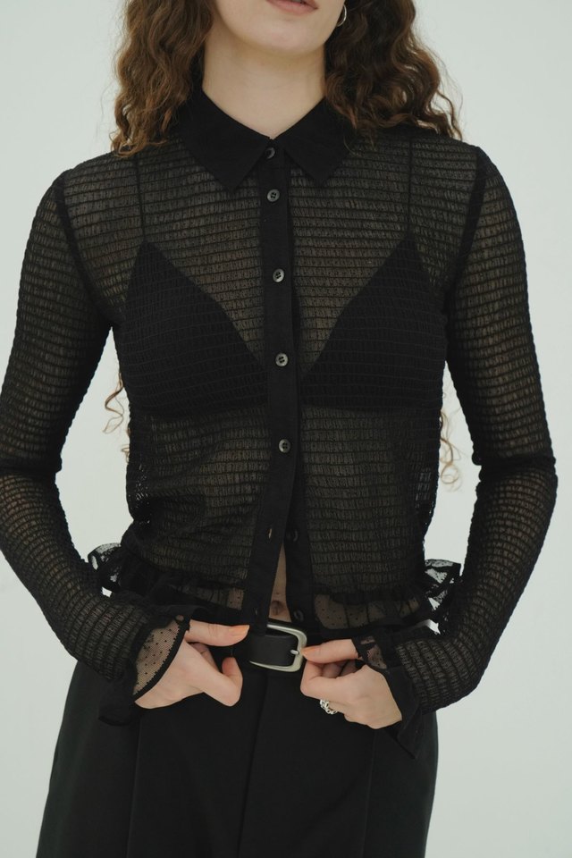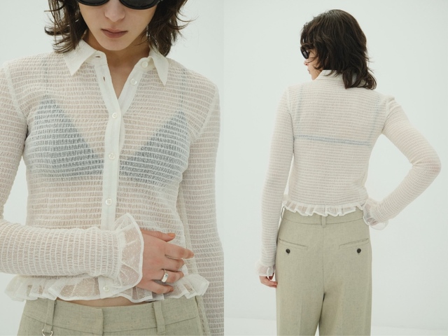 タイトめなシルエットに仕上げることで、女性らしさの中にモードな印象を感じさせる1枚に。裾や袖口には華奢なフリルをあしらい、さりげないアクセントをプラス。メッシュならではの程よい透け感に、シャーリングのかかっていない襟や前立てでメリハリをつけることで、すっきりと見せています。
