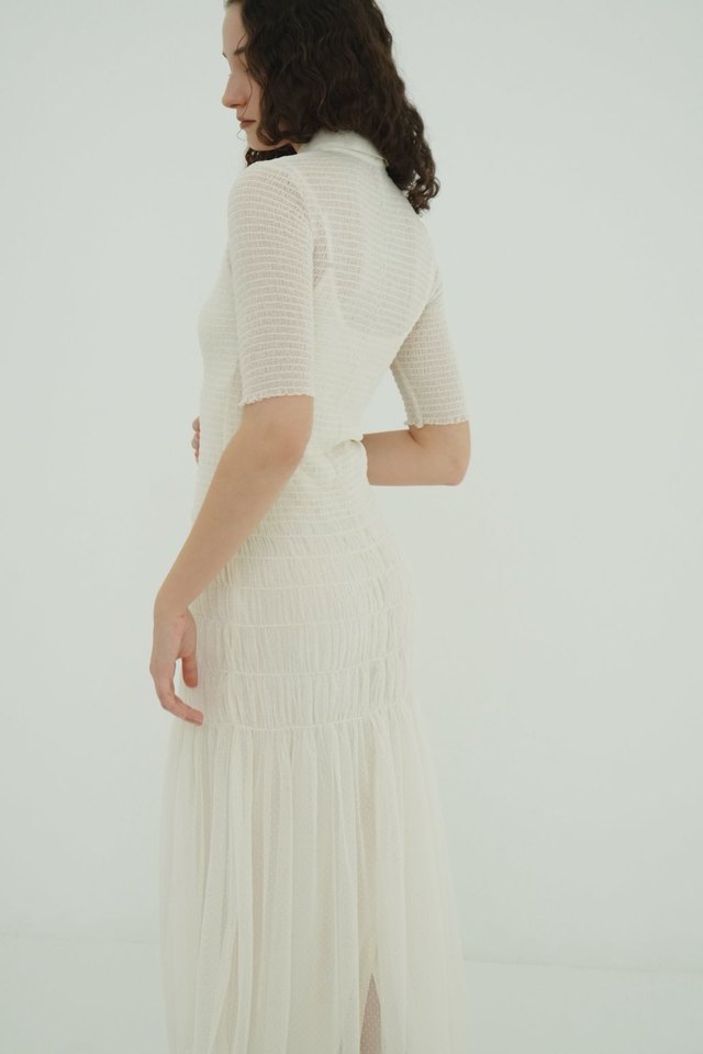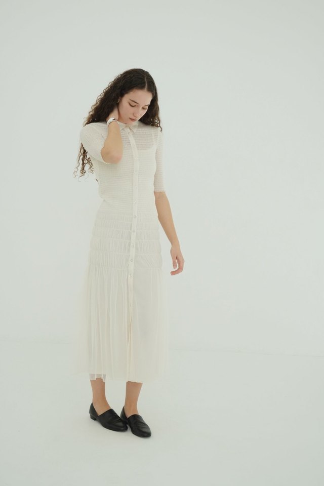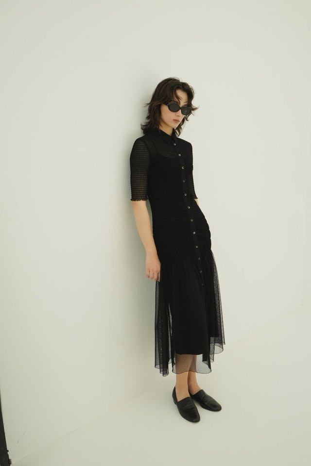 繊細なシアードット柄のメッシュに、シャーリングで表情を加えたワンピース。