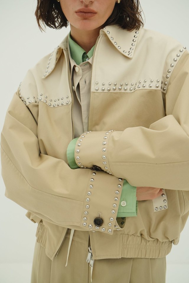 今シーズンのテーマ “HUG” から着想を得た、存在感のあるスプリングジャケット。カジュアルなドリズラージャケットをベースに、スタッズを贅沢にあしらい、エッジを効かせながらもモードなバランスに仕上げました。
