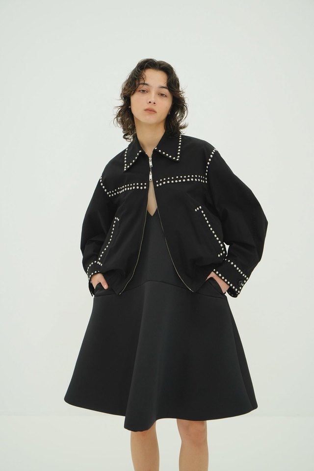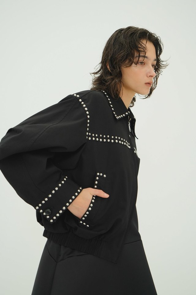 ブラックは単色ですっきりとした印象に仕上げました。シルバーのスタッズがアクセントに効いています。逆開ファスナー仕様なので、スタイリングによって下から開けて抜け感を出して着ていただけます。