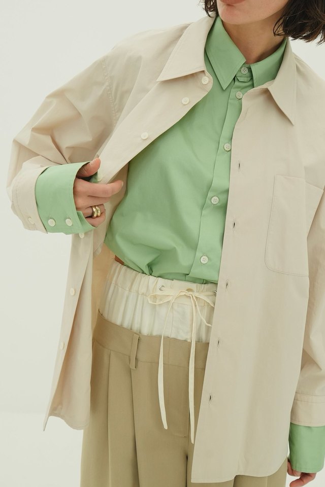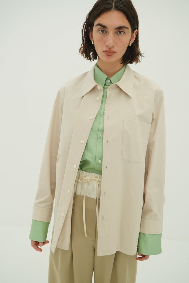 異なる2枚のシャツを重ねてドッキングさせることで、1枚で奥行きのあるスタイリングが完成するデザインに仕上げました。