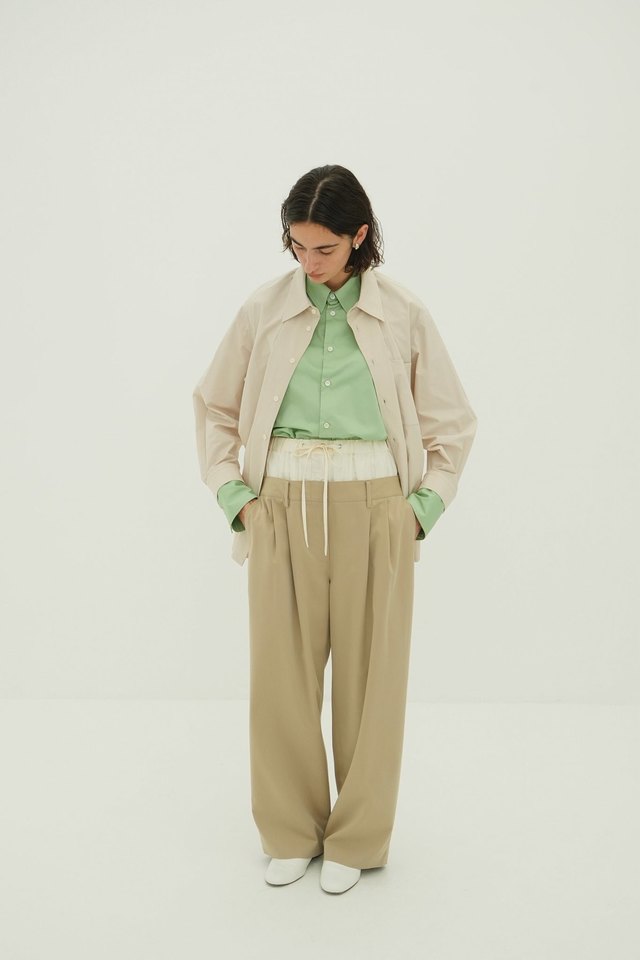 コントラストの効いた配色と異素材の組み合わせが、自然な立体感を生み、シンプルなボトムと合わせるだけでも印象的な着こなしに。インナー側のシャツにはスリットを入れ、フロントのみをタックインするなどアレンジもしやすくしています。
