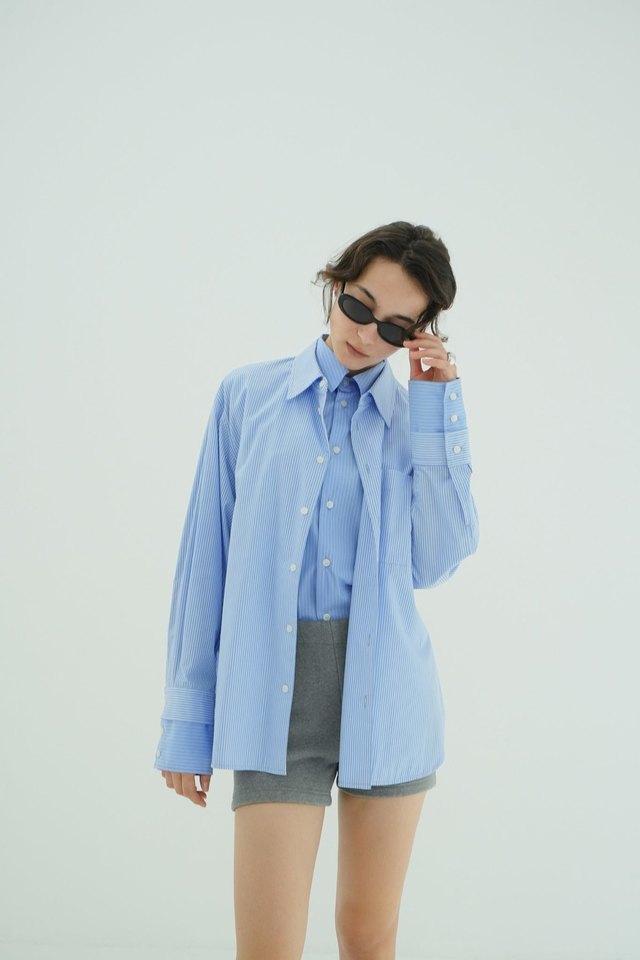 ストライプはピッチの違うストライプのシャツをレイヤード。内側の方がブルーが濃く、視覚効果ですっきりと引き締めてくれます。