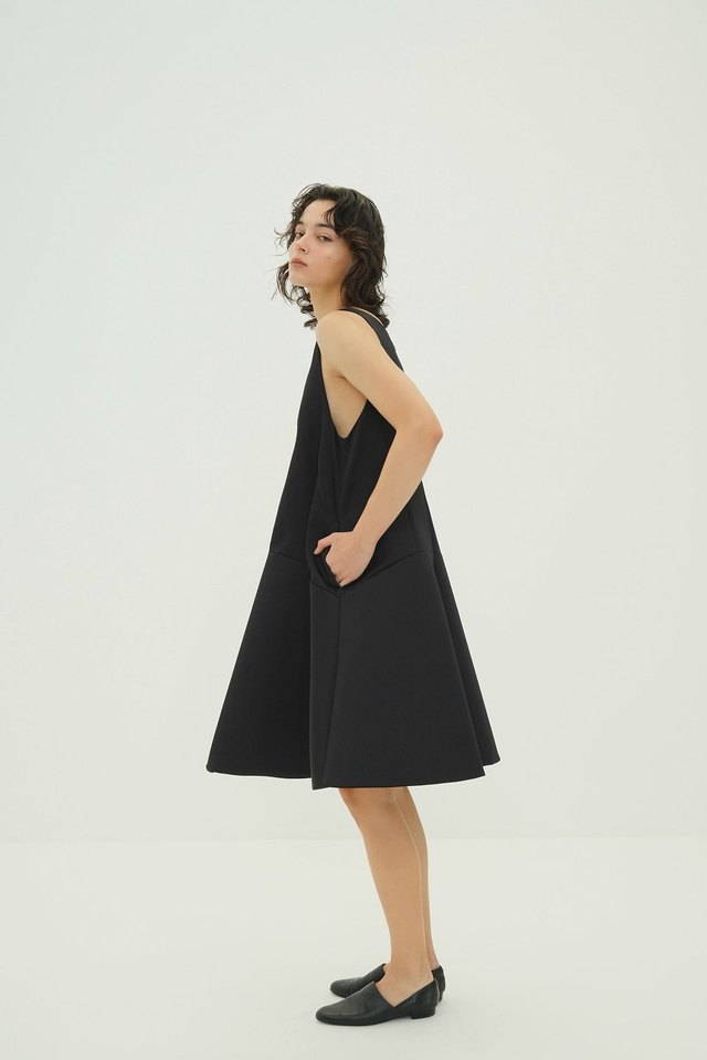 スカート部分にボンディング加工を施し、フォルムが美しく映える立体的なシルエットに仕上げたジャンパースカート。