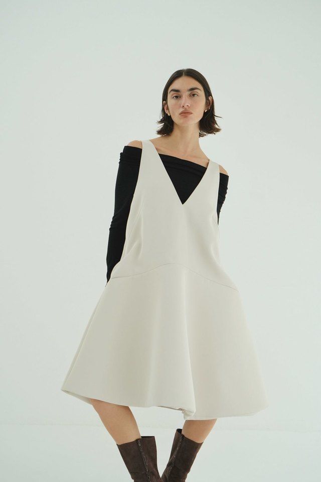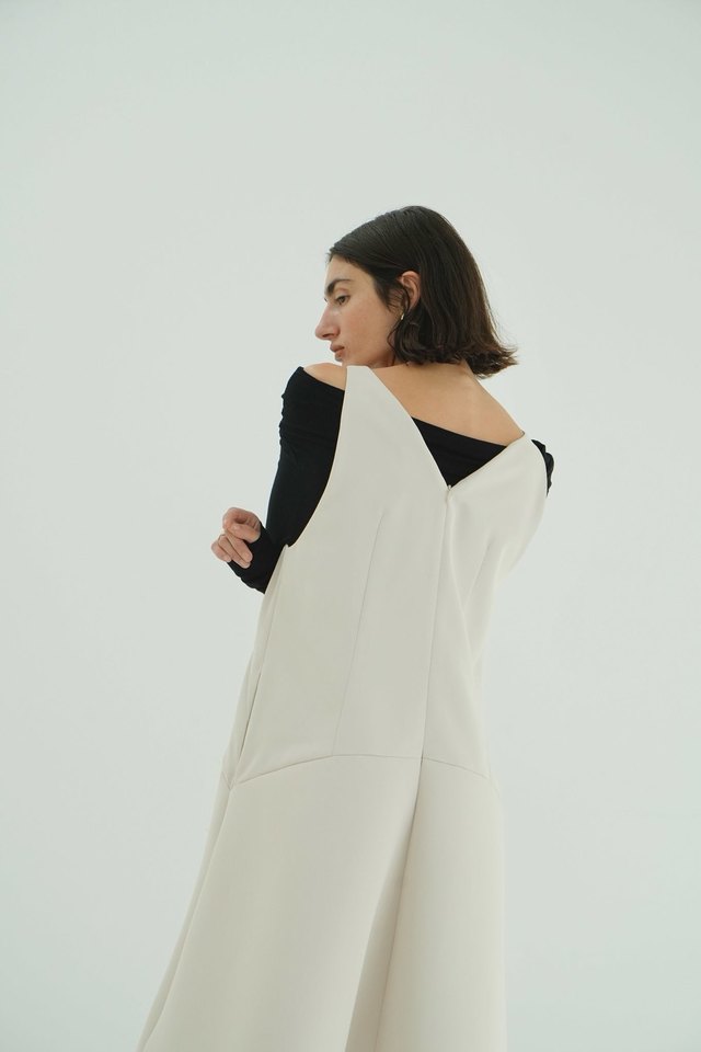 深めに開けたVネックラインが顔まわりをすっきりと見せ、インナー次第で雰囲気を変えられるのも魅力。カットソーやニット、シアートップスなどを重ねることで、シーズンに合わせたレイヤードを楽しめます。素材には上品な艶のあるバックサテンを使用し、構築的なシルエットの中に程よい女性らしさをプラスしています。