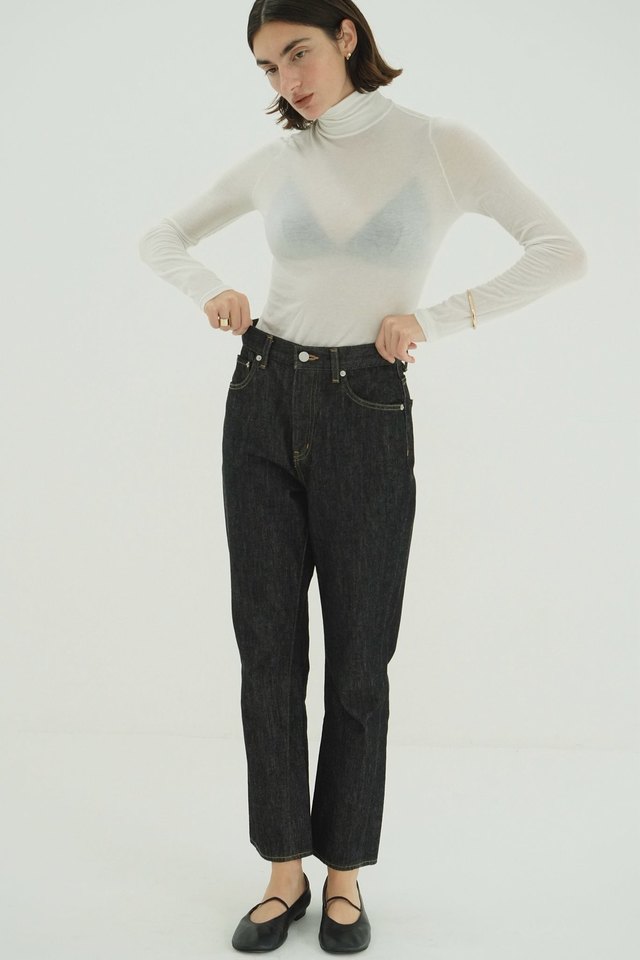 すっきりとしたラインで細見えを叶えつつ、スタイリングにほどよい存在感をプラスしてくれるデザイン。トップスを選ばず、シーズンを問わず活躍するデニムです。