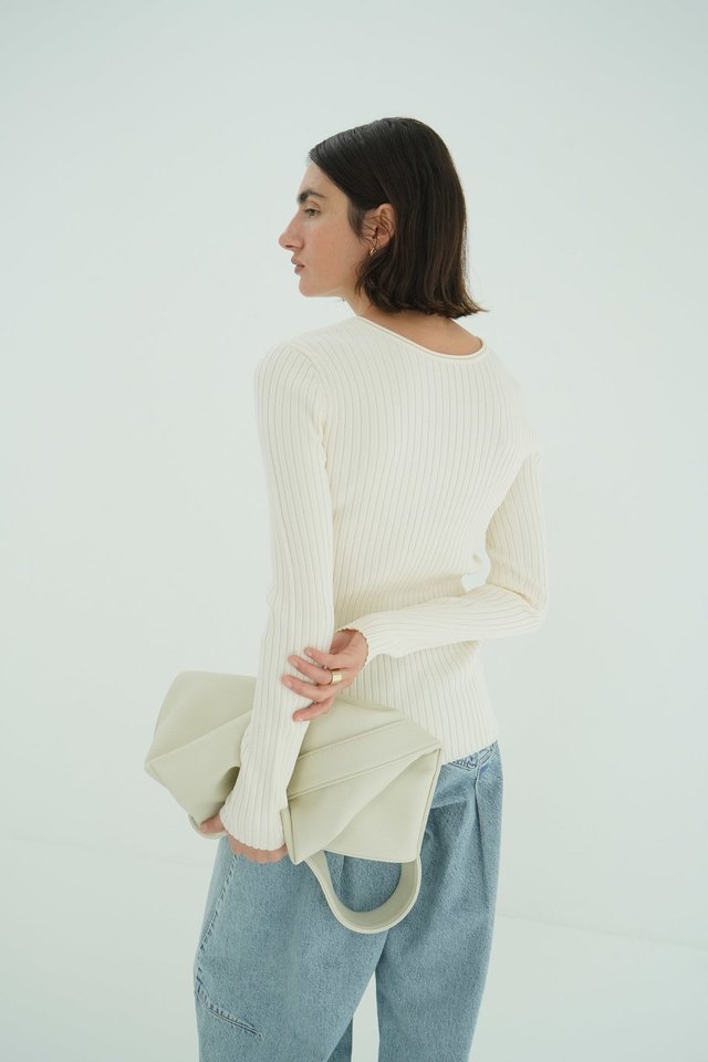 前後どちらでも着られるWフェイス仕様で、着方によって印象を変えられます。ボタンを後ろにすると、クルーネックのシンプルなリブニットとして着られます。程よい肉感なので、インスタイルも楽しめます。