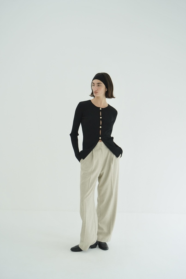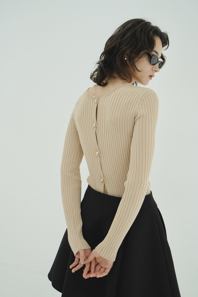 ミニマルな佇まいの中に、ゴールドボタンをさりげなく効かせたニットトップス。程よくフィットするワイドリブが、体のラインを美しく引き立ててくれる女性らしいアイテムです。ボタンとボタンの間が少し開いているので、細スリットのように上品な肌見せができるのもポイント。
