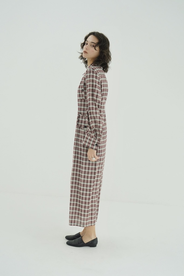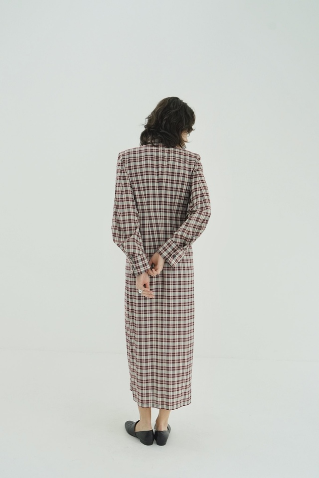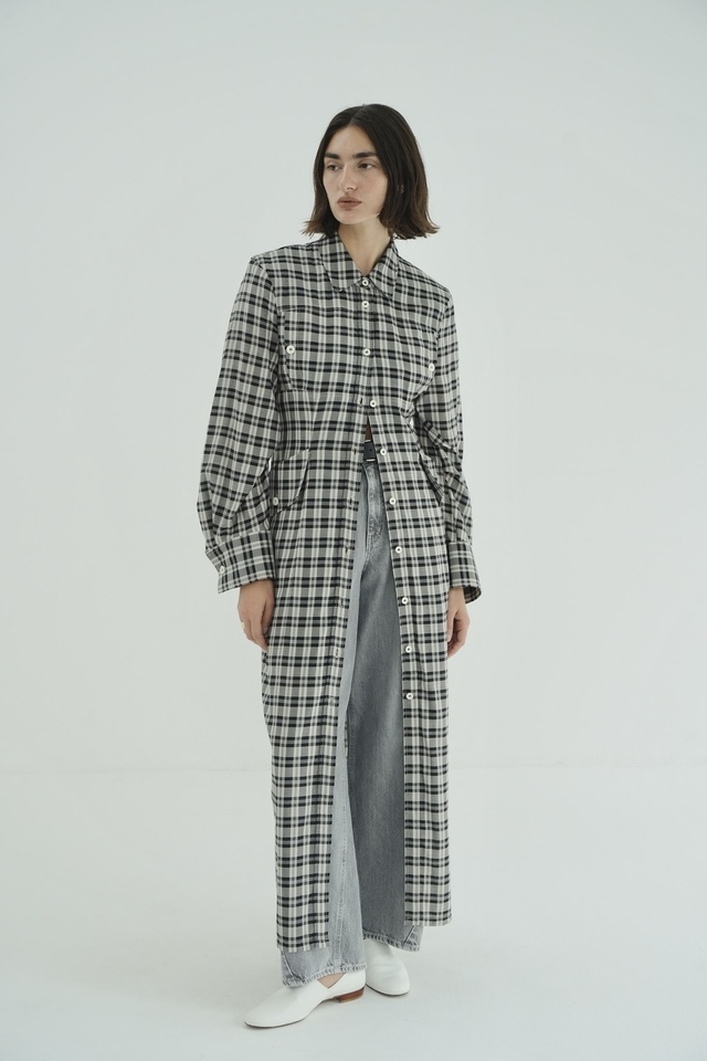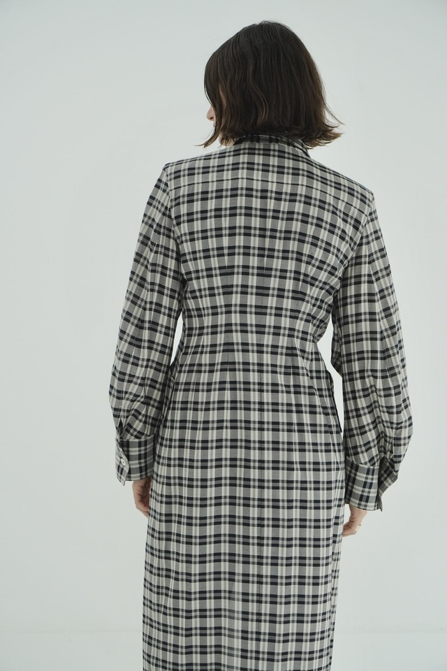 構築的なシルエットが印象的なチェックシャツワンピース。直線的に落ちるラインに、程よくウエストをシェイプさせることで、1枚で様になるシルエットに仕上げました。肩周りと袖にも立体感を持たせ、女性らしさの中にもマニッシュな要素を取り込んでいます。