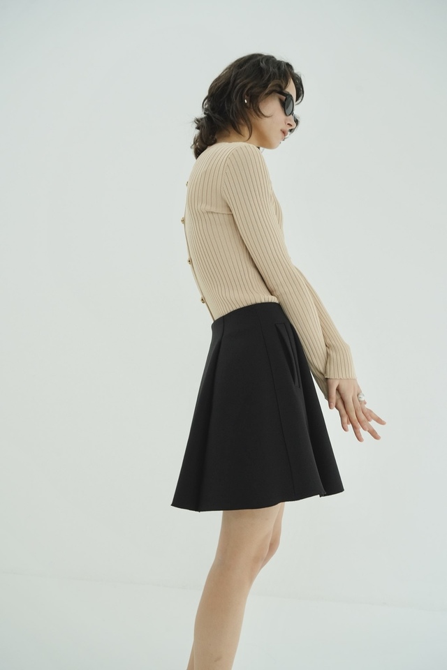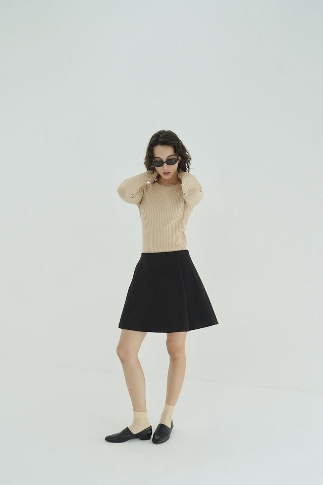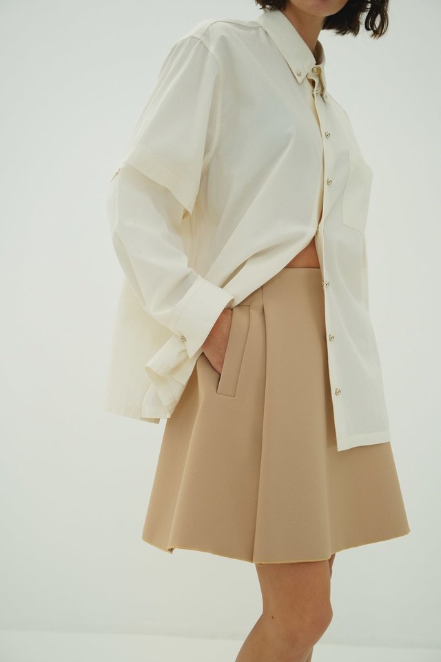 前後に入れたタックが立体感のあるフレアを生み出し、コンパクトな丈感でも甘くなりすぎない仕上がりです。