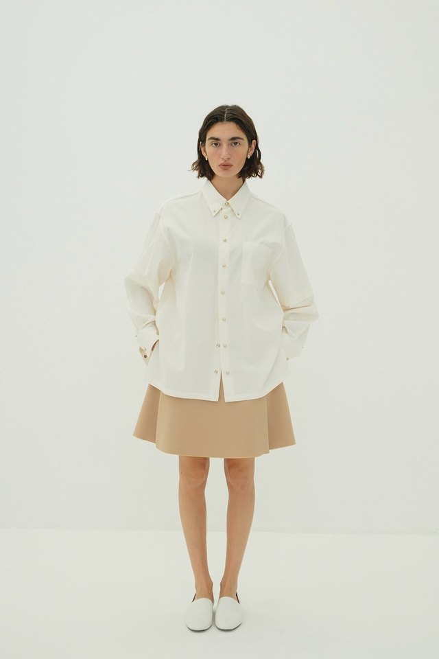 ボタンは上からウエストの位置くらいまで4個配置。ウエスト下はスリットのように開くので、自然と抜け感が出て色々なシルエットのボトムスと合わせやすいデザインです。