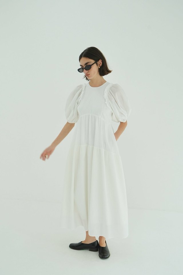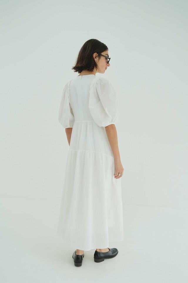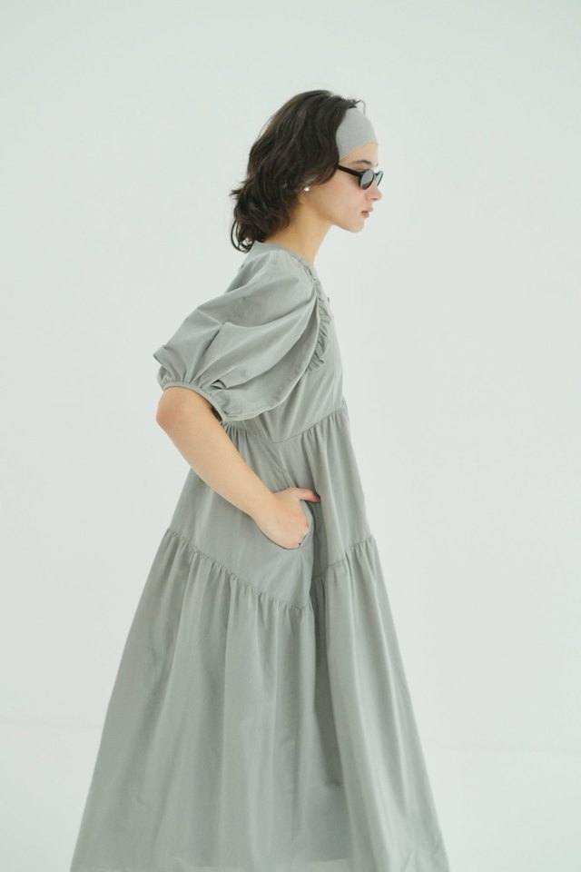 立体的なバルーンスリーブとフリルが印象的なワンピース。1枚で存在感のある、フォルムで魅せる一着に仕上げました。