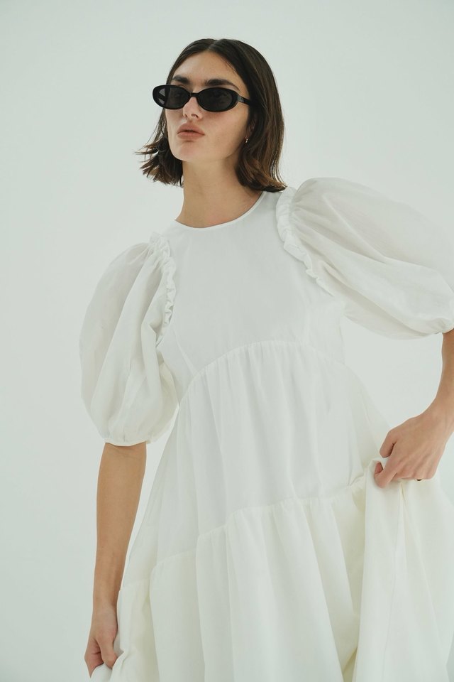 サイドから見たシルエットまで抜かりなく。たっぷりと分量をとったボリュームスリーブと、段差をつけたティアードフレアが動くたびに揺れて華やか。
