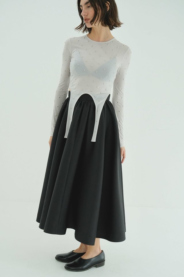 Iラインのスカートを大胆にサークル状にカットし、内側のミニスカートが覗くレイヤードデザインが特徴的。動きに合わせてさりげなく肌が見えることで、モードな印象の中に女性らしい抜け感をプラスしました。
