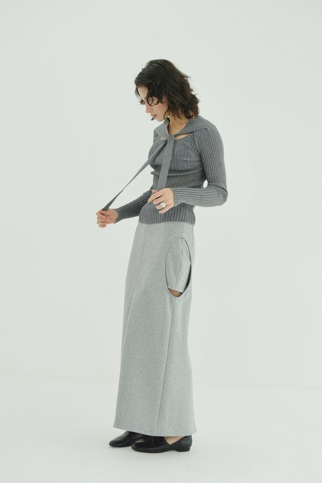 ブランドらしいカッティングが際立つスカートを、今季は柔らかな裏毛素材で再構築した一枚。しっかり長めのロング丈で、大人っぽいスウェットスカートです。