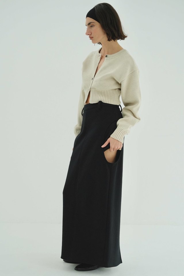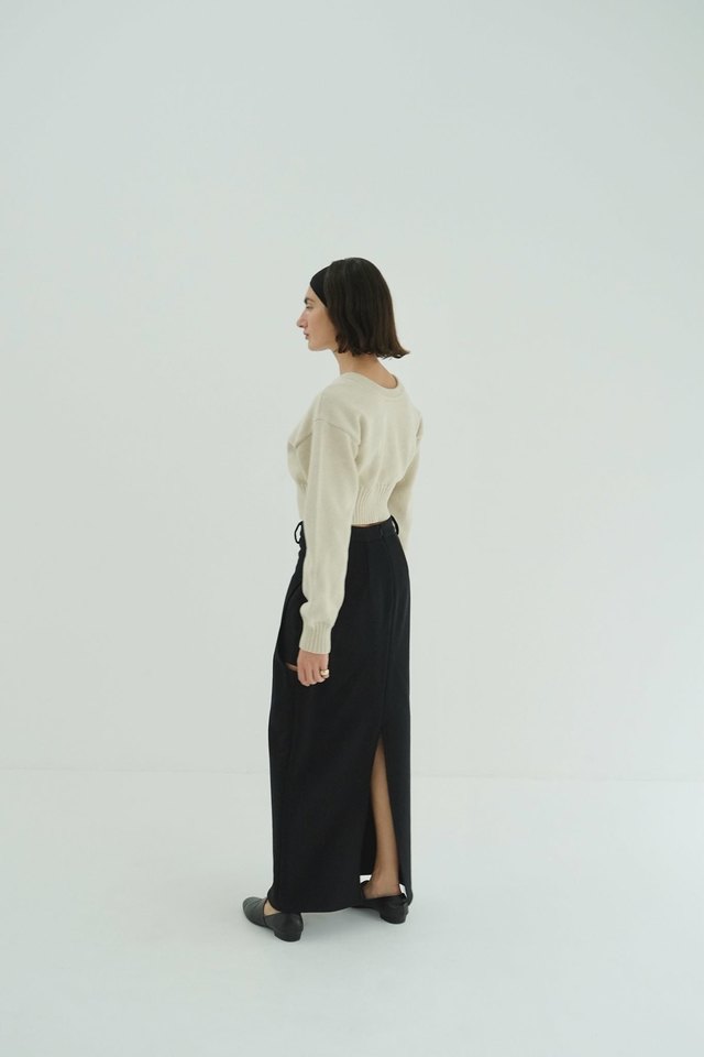 バックには深めのスリットを入れ、足さばきの良さと軽やかな印象を両立。直線的なシルエットでありながら、ディテールの重なりが奥行きを生み、シンプルなトップスと合わせるだけでもスタイリングが決まります。