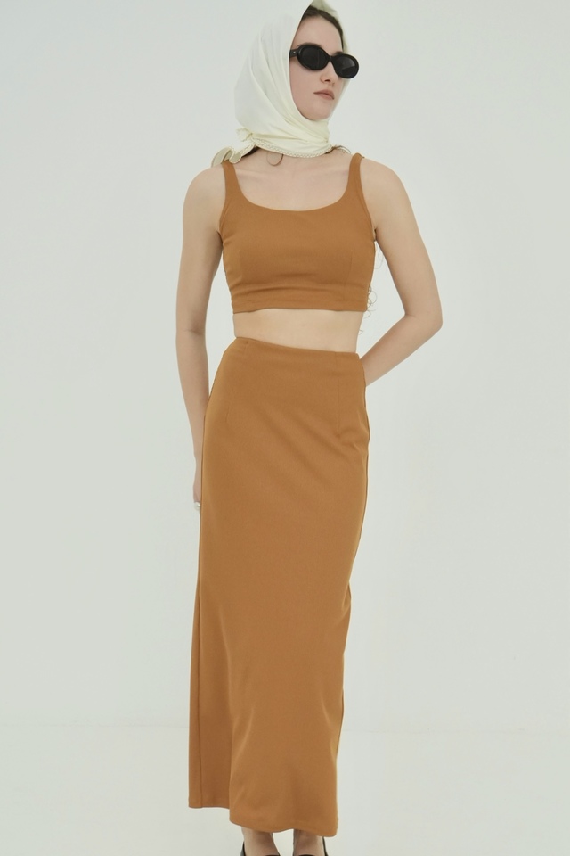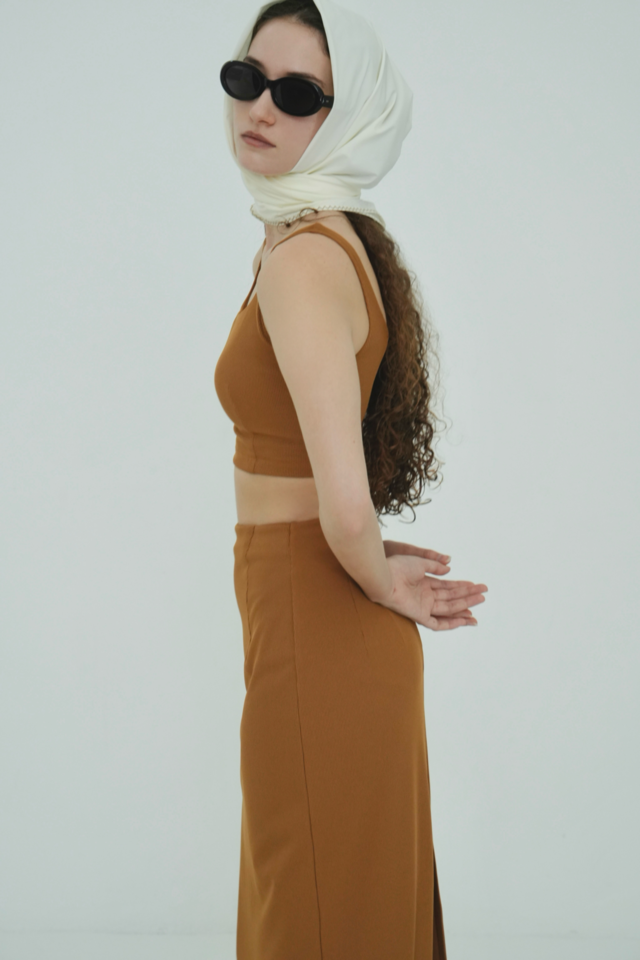 CLANEで今季初めて登場した、凹凸感のあるリブ素材を使用したロングスカートタイプのスイムウェア。シャープなスクエアネックのブラトップに、マキシスカートとショーツを組み合わせた3点セットで、落ち着いた雰囲気の中にモードな印象をプラスしてくれる一着です。