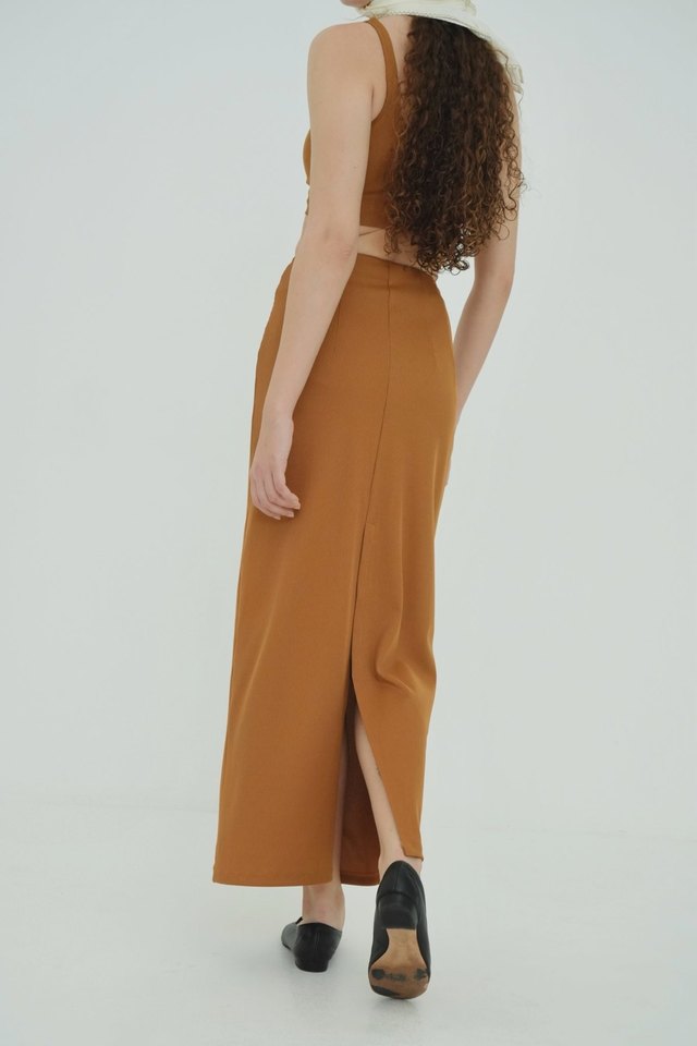 タイトシルエットのスカートには深めのバックスリットを施し、女性らしさと動きやすさを両立。ローウエストでの着用も可能で、スタイリングに変化をつけられるのも魅力です。
