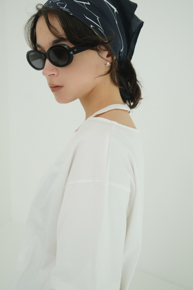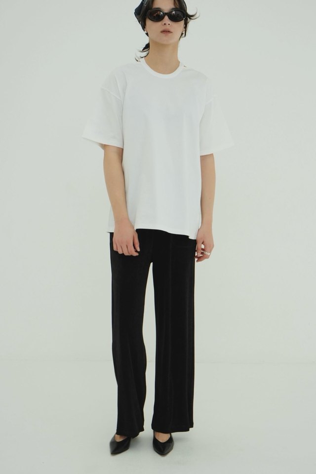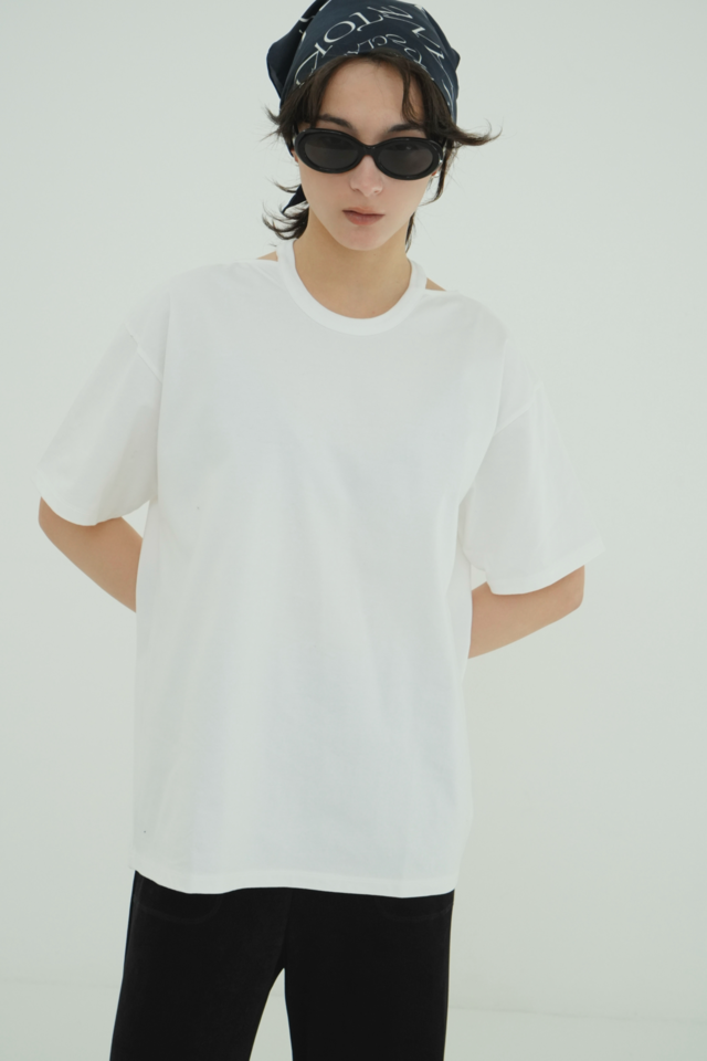 シンプルなデザインながら、程よい肌見せとディテールがアクセントとなり、ベーシックなTシャツとはひと味違ったスタイリングに。