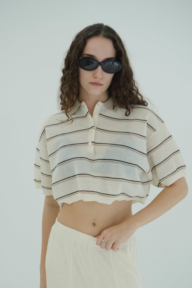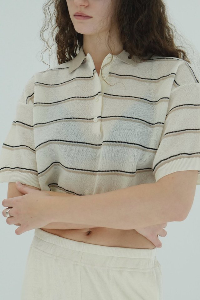 透け感のある編地が印象的な、ボーダーポロニットトップス。