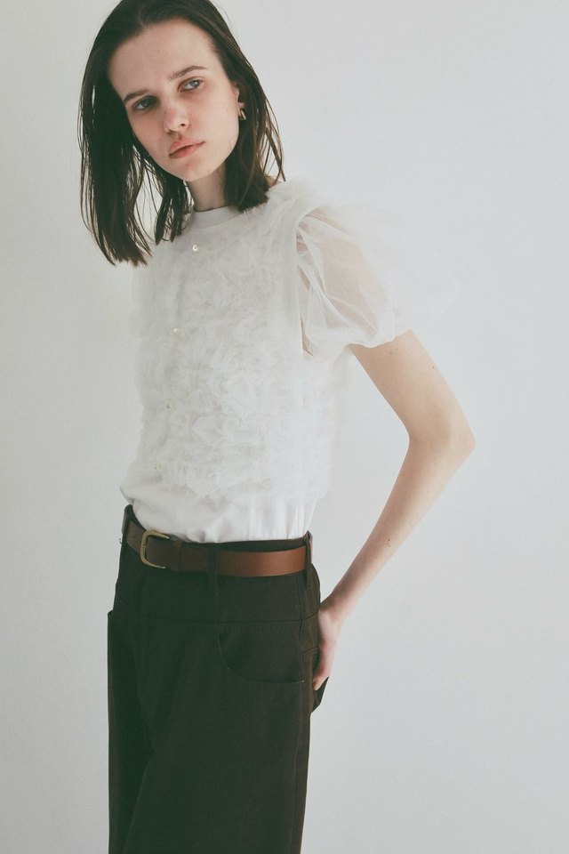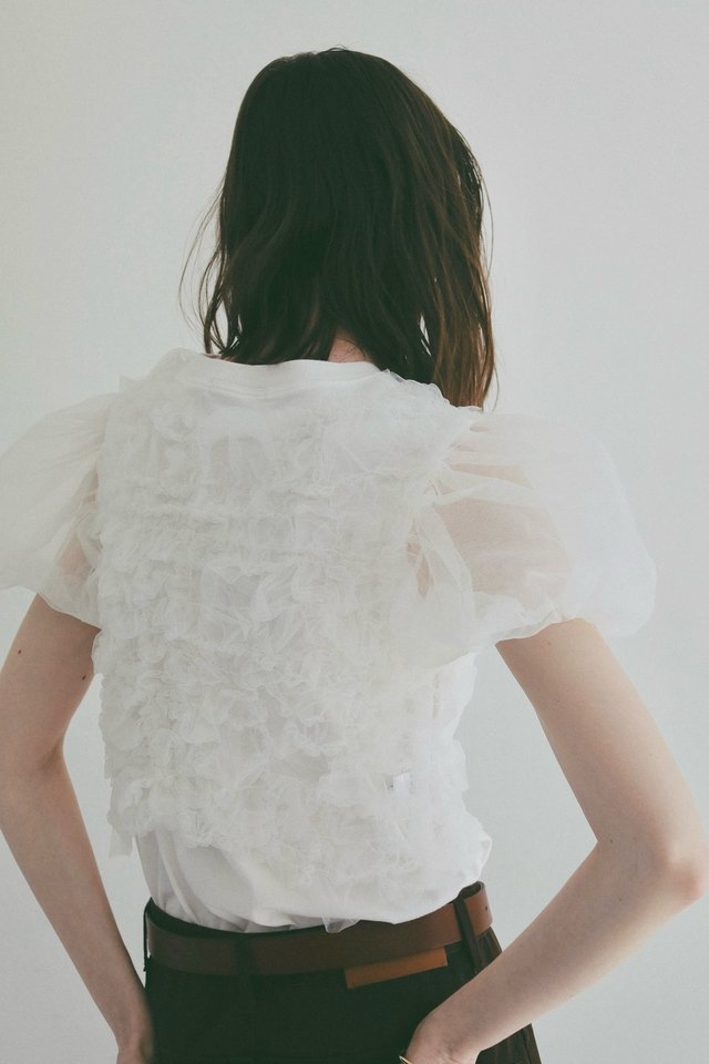 立体感のあるチュールがスタイリングに華やかさを添えながらも、ベースは肌なじみの良いカットソー素材で、見た目以上に取り入れやすいのが魅力。気負わず着られて、自然とスタイリングが決まります。