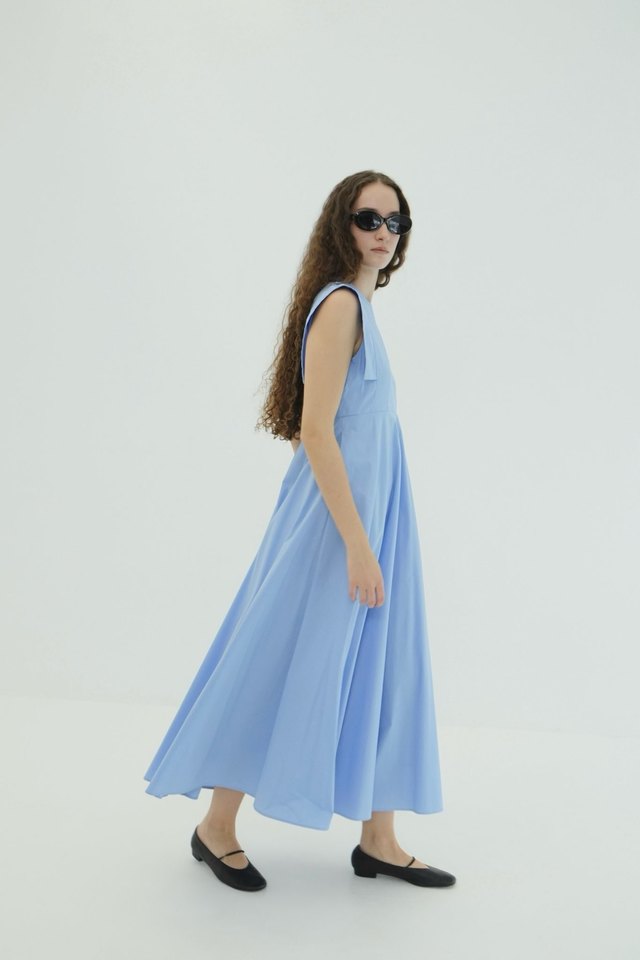 襟元はスラッシュネックで、さりげなくデコルテを見せることで自然な余白が生まれます。反対側はチョーカーのようなディテールになっており、前後で異なる表情を楽しめるのもポイントです。