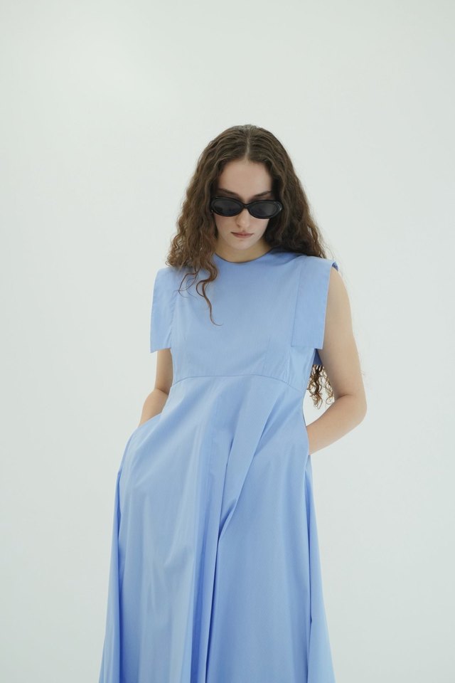 一枚でスタイリングが完成する、デザインワンピース。ストライプ柄のサックスは今季の新色として登場しました。