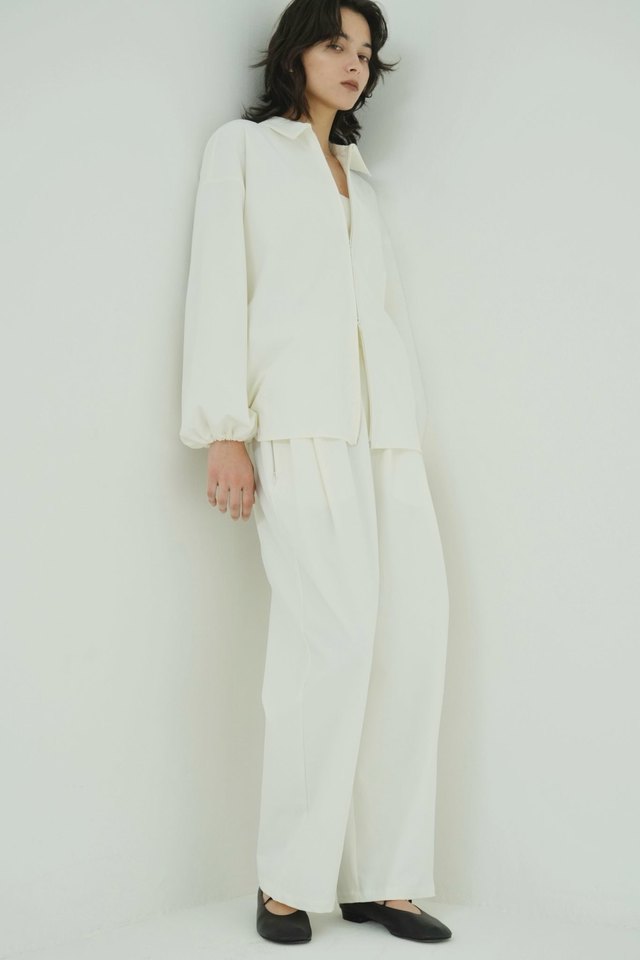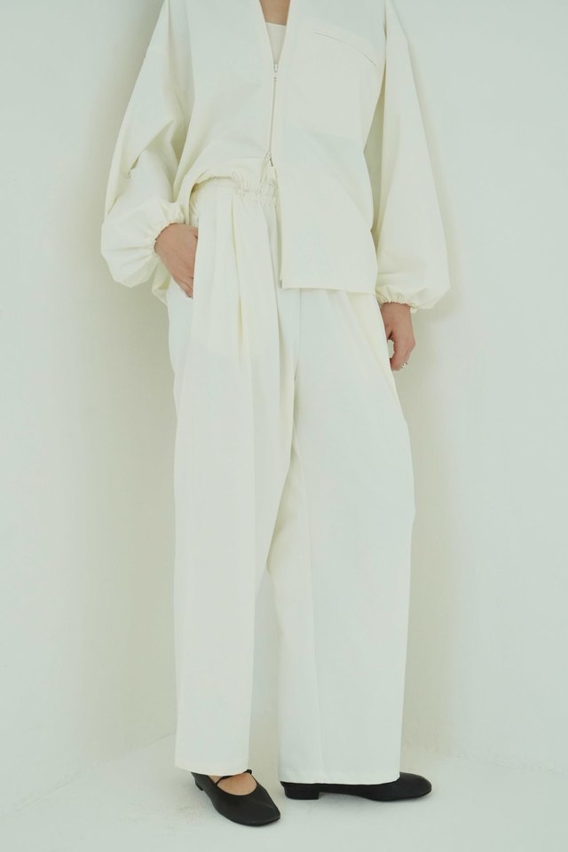 シルエットはゆとりがありつつも、縦に落ちるタックとウエストデザインでバランスよく仕上げ、リラックスして着ていただけつつもスタイルアップも叶う一本に。ウエストはぐるりとゴム仕様で、フロントのドローストリングによりフィット感の調整が可能です。