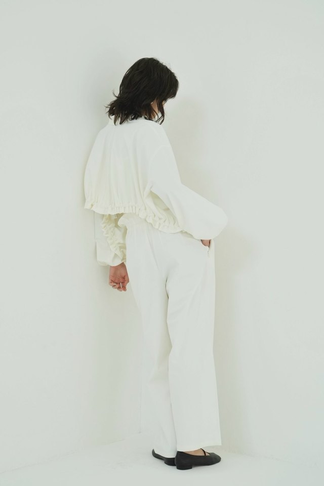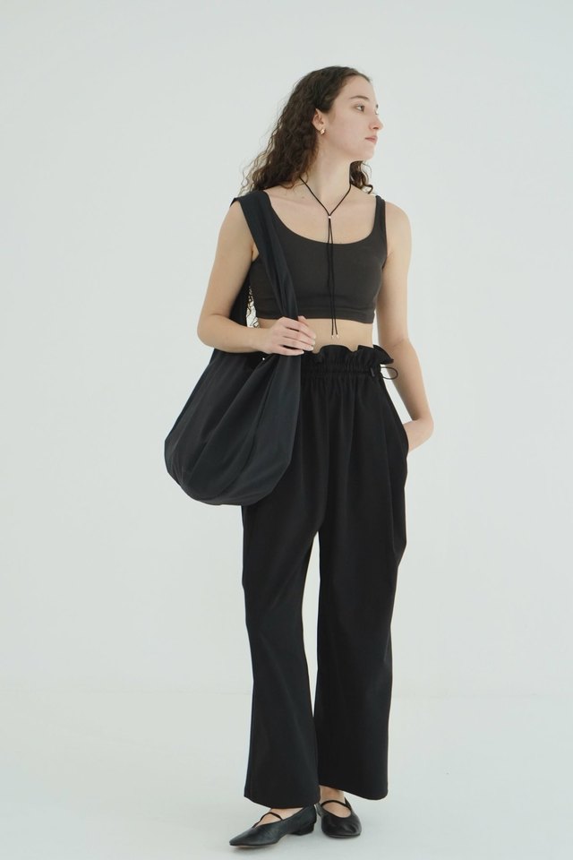 ウエストはゴム仕様でリラックスした穿き心地ながら、シルエットにしっかりと立体感を持たせることで、カジュアルすぎないバランスに。裾のドローストリングでフォルムの調整も可能です。