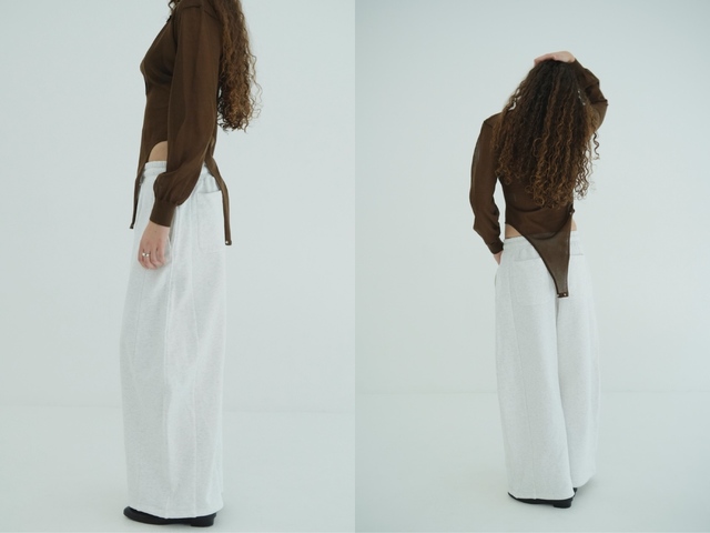 ゆとりのあるサイズ感に、丸みを帯びた構築的なシルエットを掛け合わせることで、ラフになりがちなスウェットをモダンな印象に引き上げた一本です。