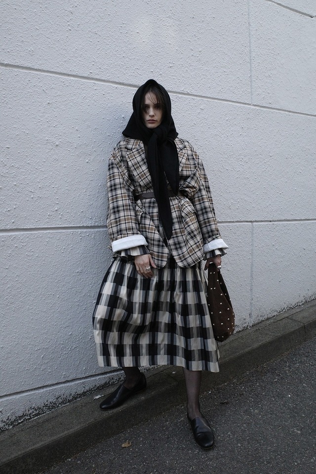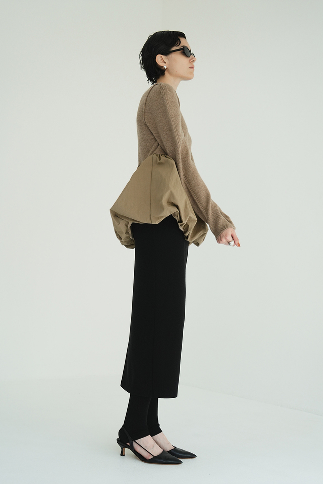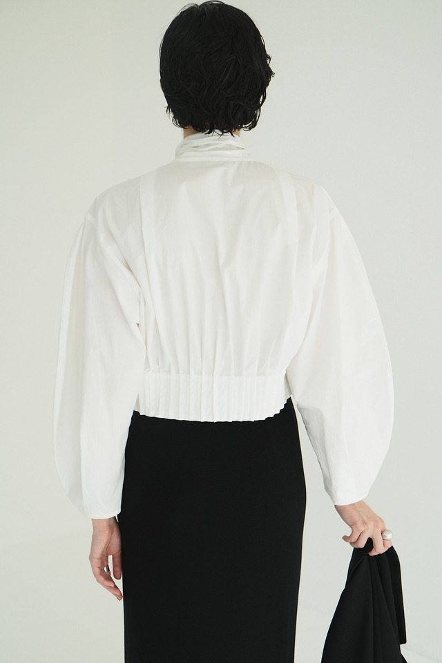 ヘム部分にはタックを施し、立体感をプラス。シンプルになりがちなシャツスタイルに、モードなアクセントを添えています。