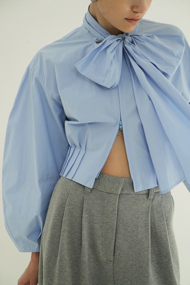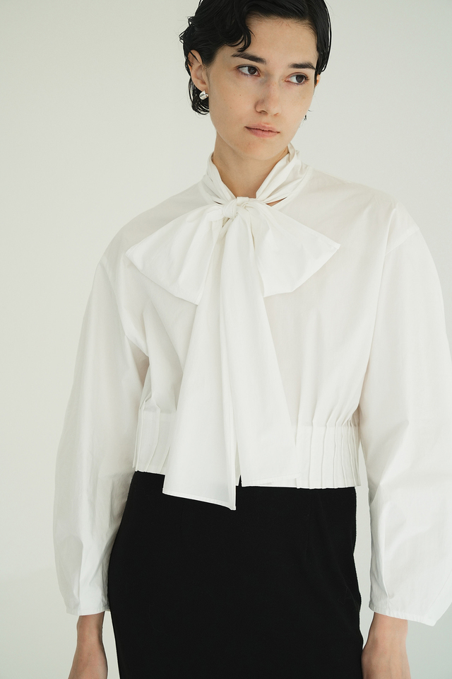 大胆なビッグリボンが目を引く、シャツ素材のブルゾン風シャツ。高密度でしなやかな風合いの生地が、上品な存在感と着心地の良さを両立しています。