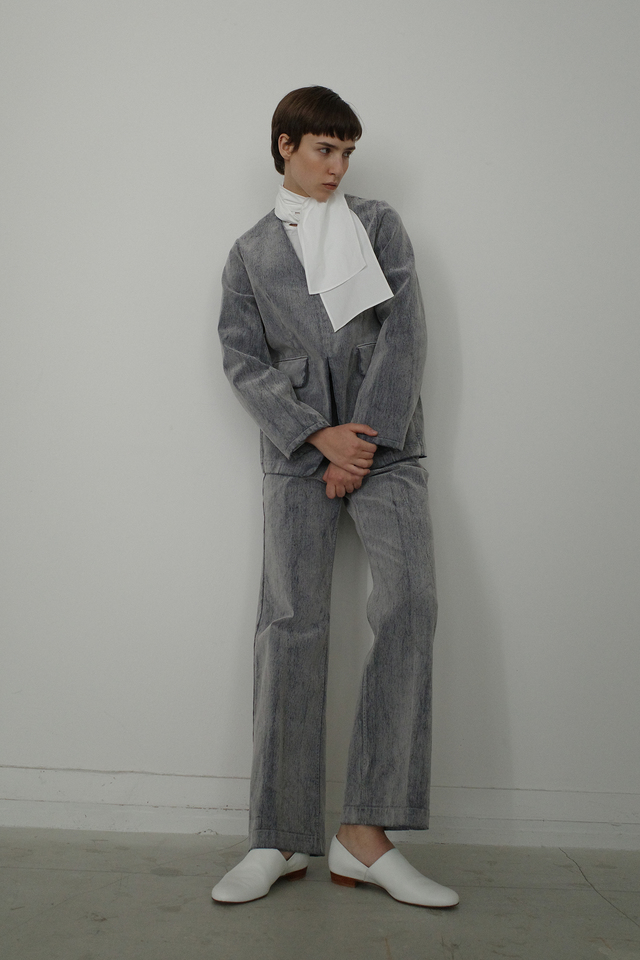 使用している生地は、日本製のしっかりとした質感と軽やかさを兼ね備えた素材。太番手のウーリー糸を横糸に使用し、ふくらみのある表情を演出。