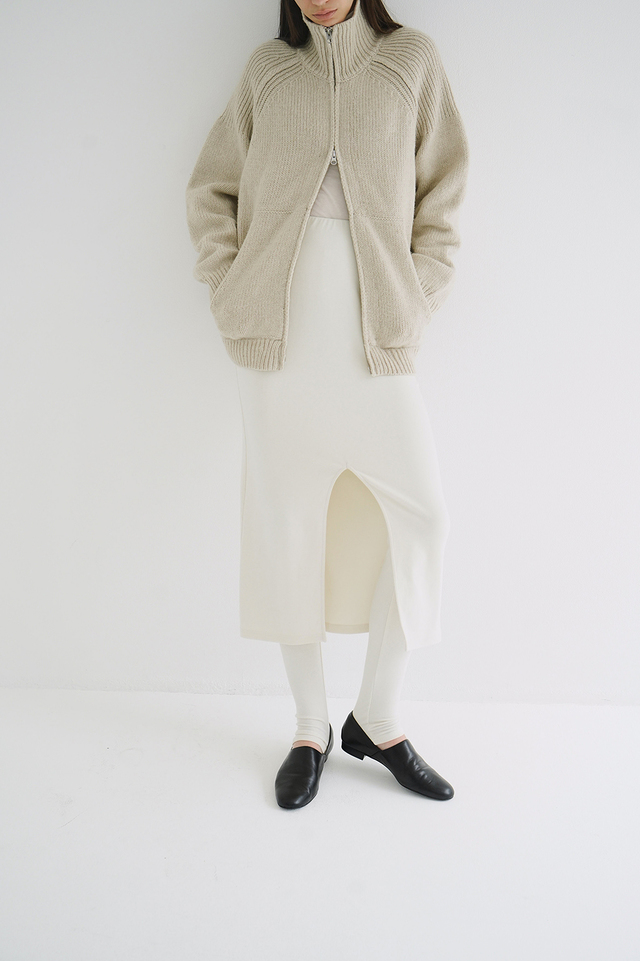 丸みを帯びたスリーブラインやヘムタックなど、ディテールにもこだわりが詰まった一枚です。逆開ファスナー仕様でシルエットの調整が可能で、インナーとのレイヤードスタイルも自在に楽しめます。