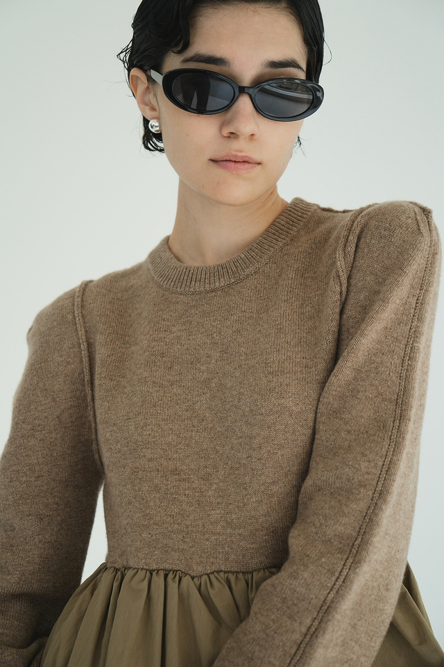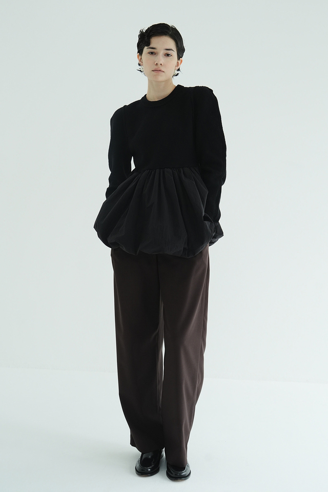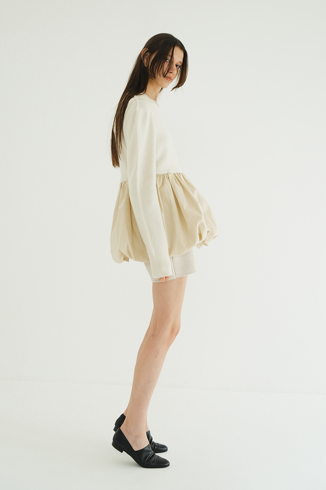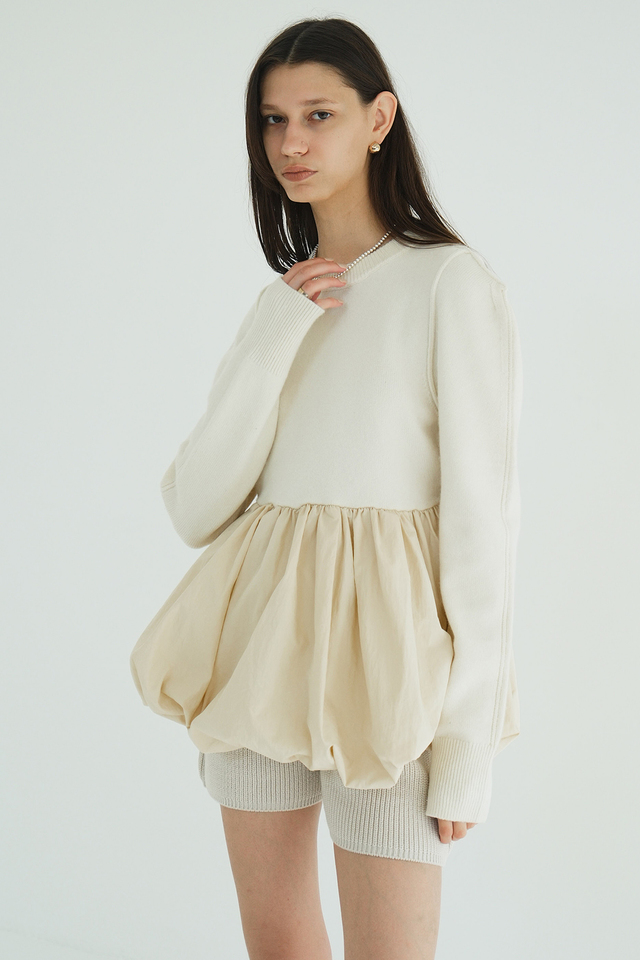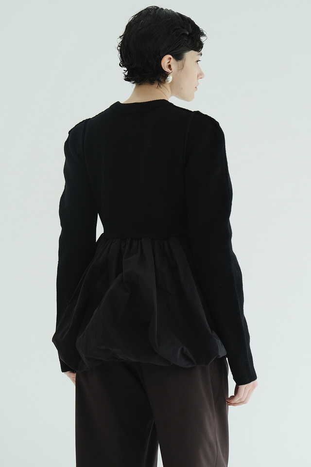 ニットとバルーンスカートがドッキングされた、デザイン性の高いニットトップス。異素材を組み合わせ、立体感と存在感のあるトップスです。
