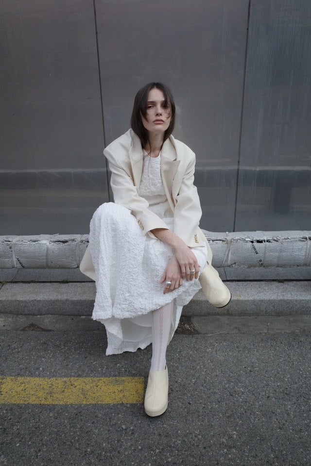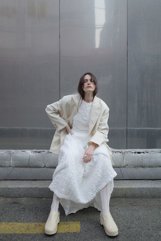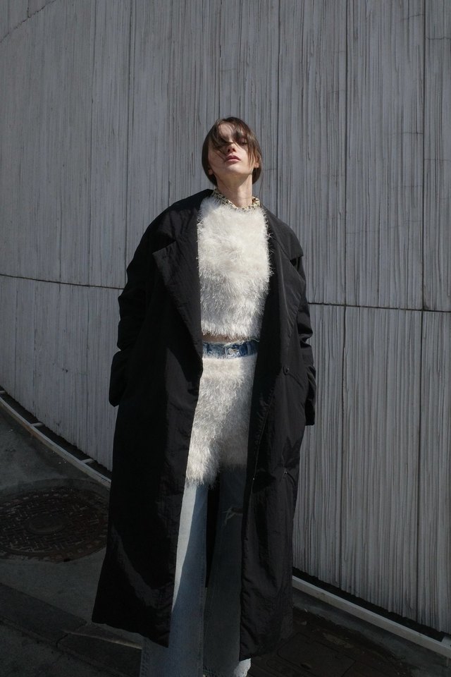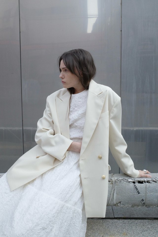 ゆったりとしたシルエットが抜け感をつくり、高密度のタイプライターならではのハリ感がクリーンなモードさを引き立てます。