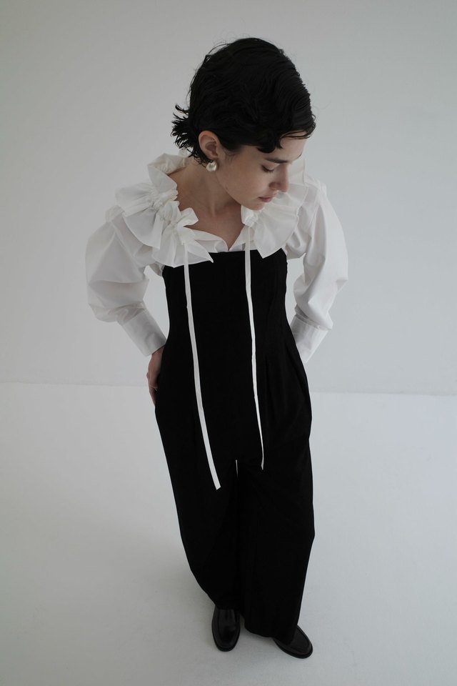 オールインワンにレイヤーしているフリルシャツも、大ぶりのフリルが顔周りを華やかに見せてくれて、ホリデーシーズンにぴったり。