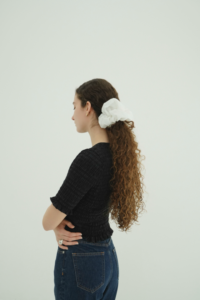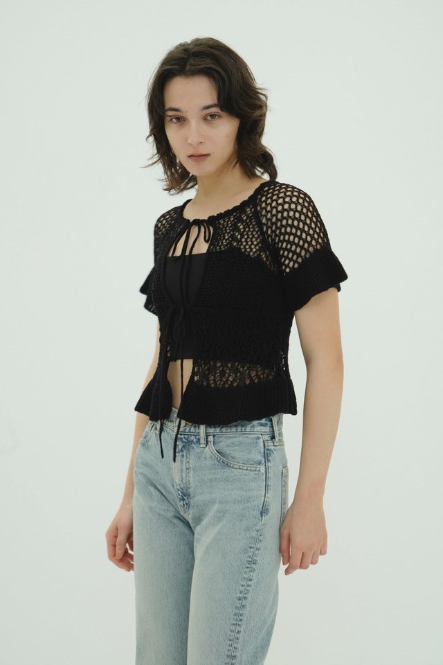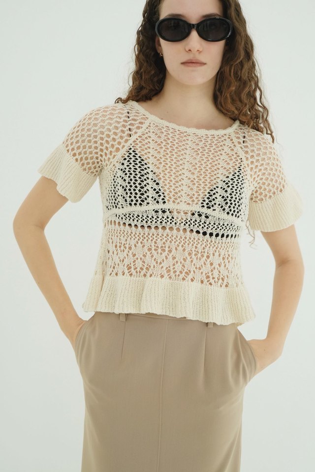 繊細な編み模様が生み出すコントラストと立体感が、シンプルな中にも奥行きのある印象に。程よい透け感が軽やかさを演出し、スタイリングに抜けをプラスしてくれます。