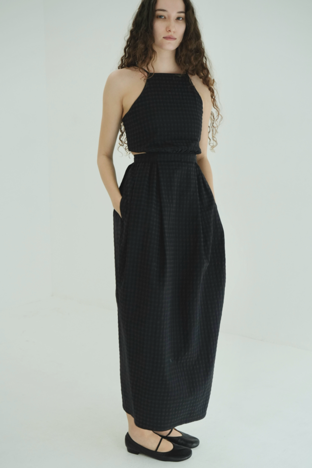 ウエストサイドに施したドーム型の開きがさりげないアクセントとなり、シンプルながらも印象に残るデザインに。スカート部分は構築的なコクーンシルエットで、動きに合わせて立体感のあるフォルムを楽しめます。