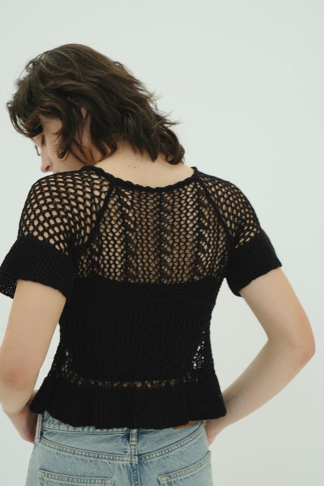 4種類の編み柄を組み合わせた、表情豊かなクロシェニットトップス。