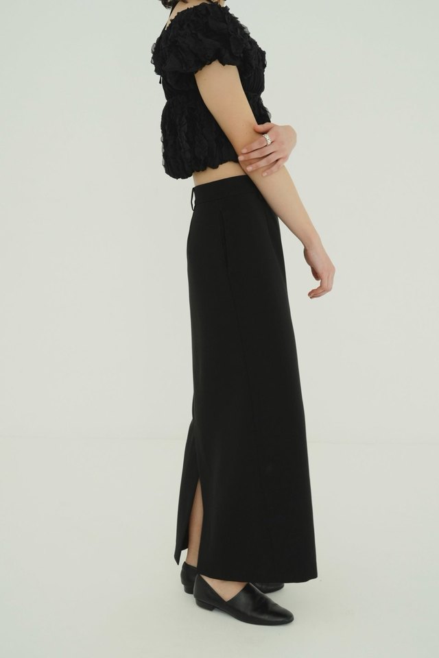 センターに施したステッチが縦のラインを強調し、すっきりとした印象に。やや厚みのあるしっかりとした素材感で、身体のラインを拾いにくく、安心感のある穿き心地に仕上げました。後ろにはスリットを入れ、ストレートシルエットでも足捌きのしやすいデザインです。