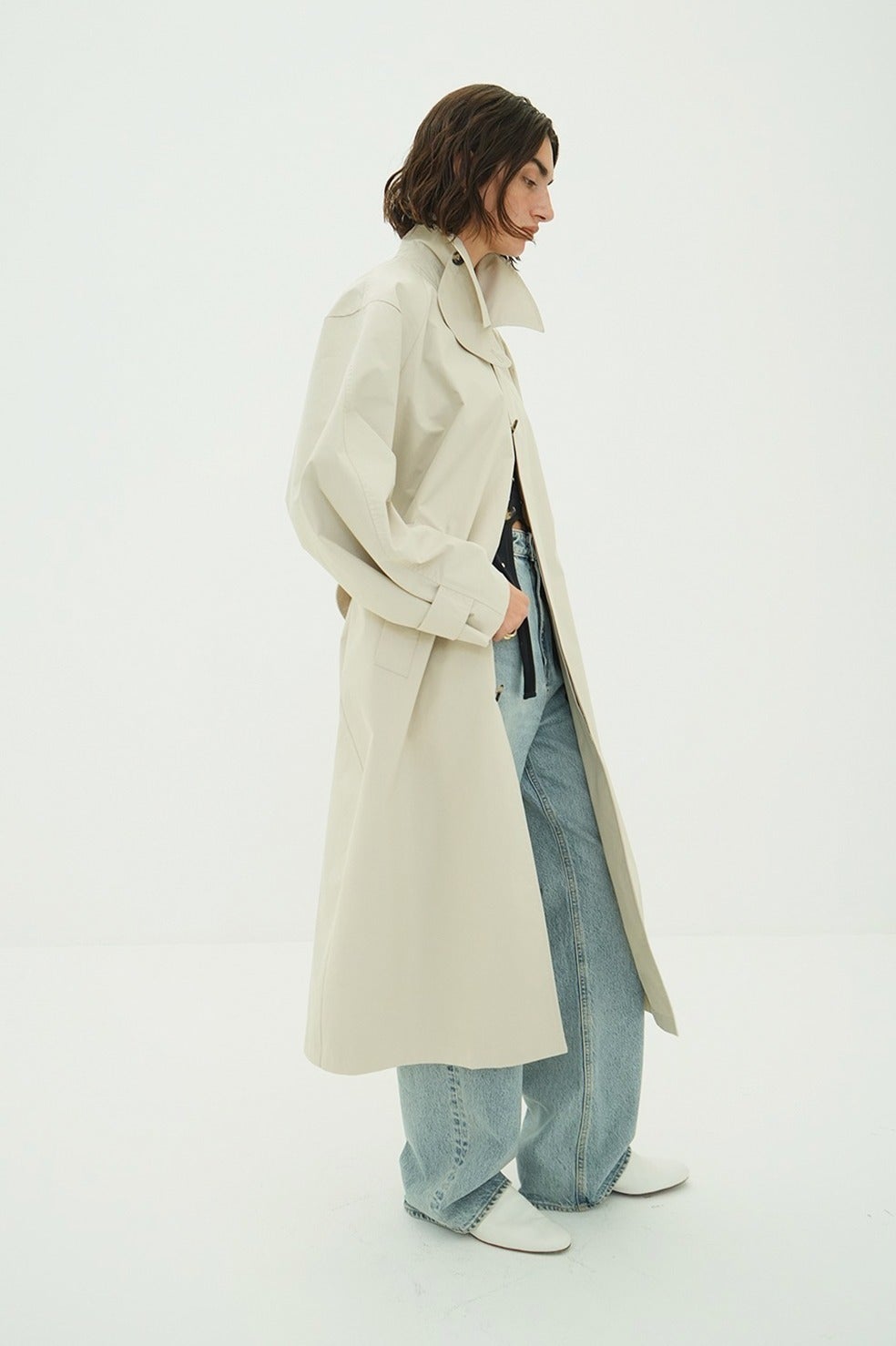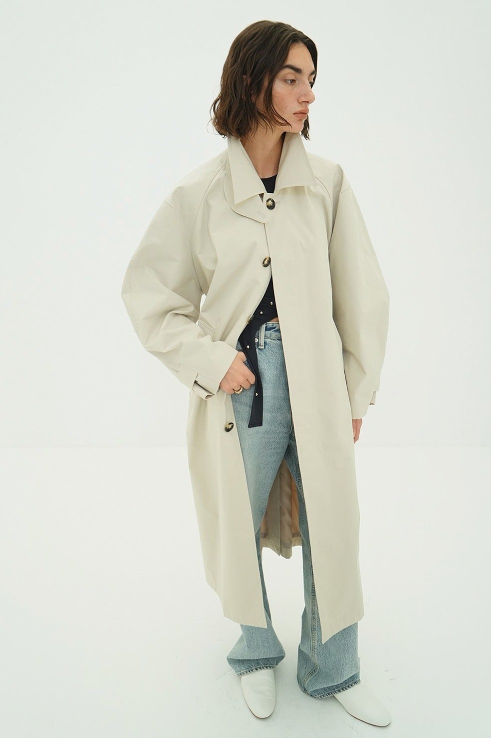 ミニマムでクリーンな印象のステンカラーコート。