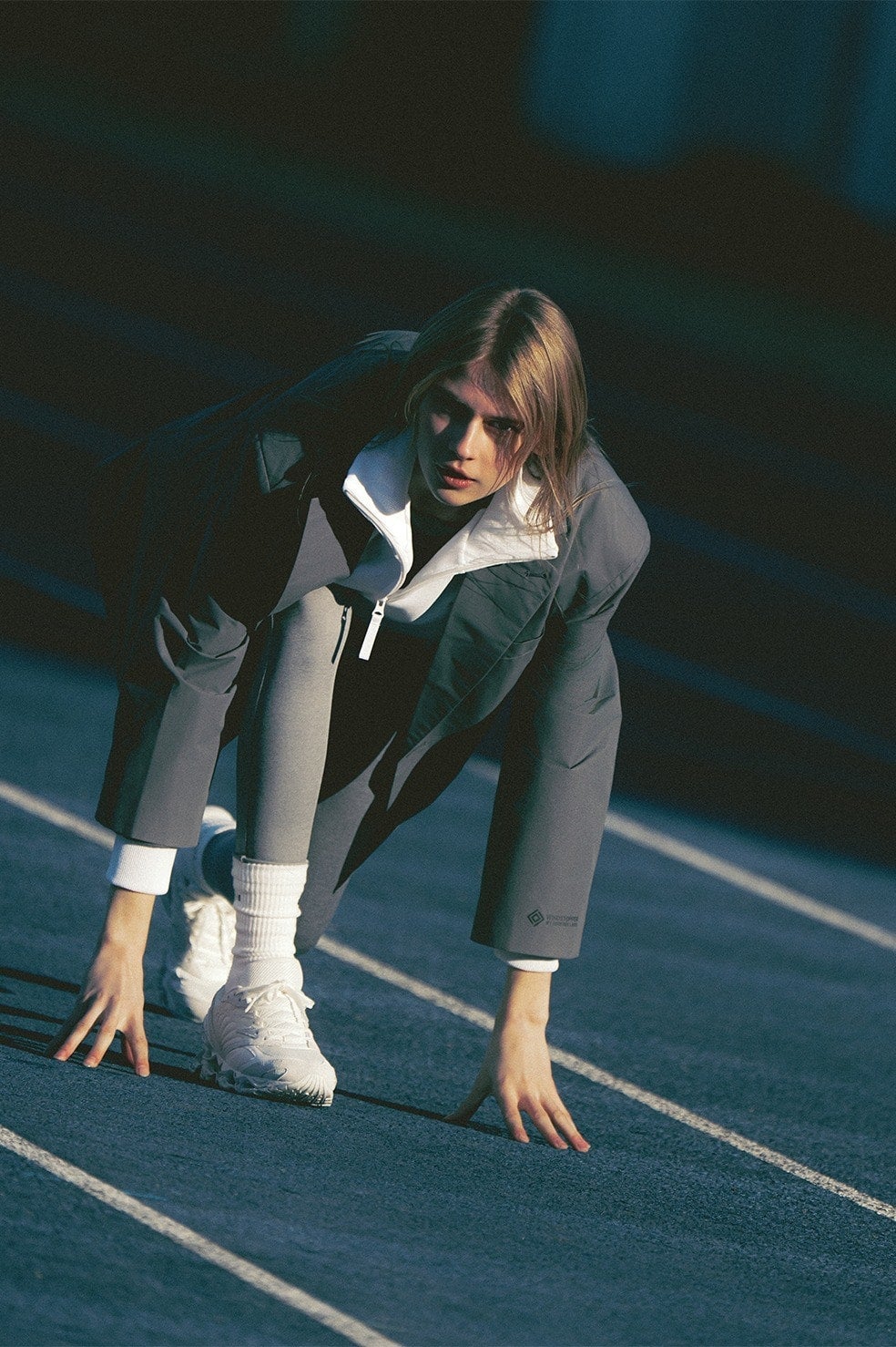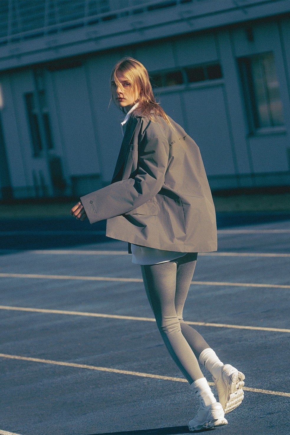 スポーツウエアの機能性を、CLANEらしいモダンでマニッシュなボックスシルエットのジャケットに落とし込みました。防風性と高い透湿性を備え、外気の影響を抑えながら衣服内の湿気を逃し、快適な着用感を保ちます。