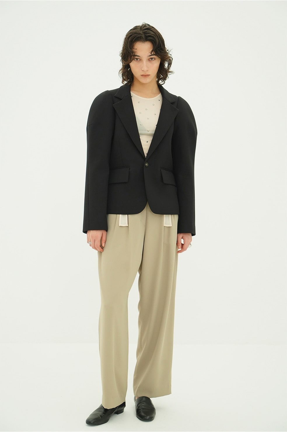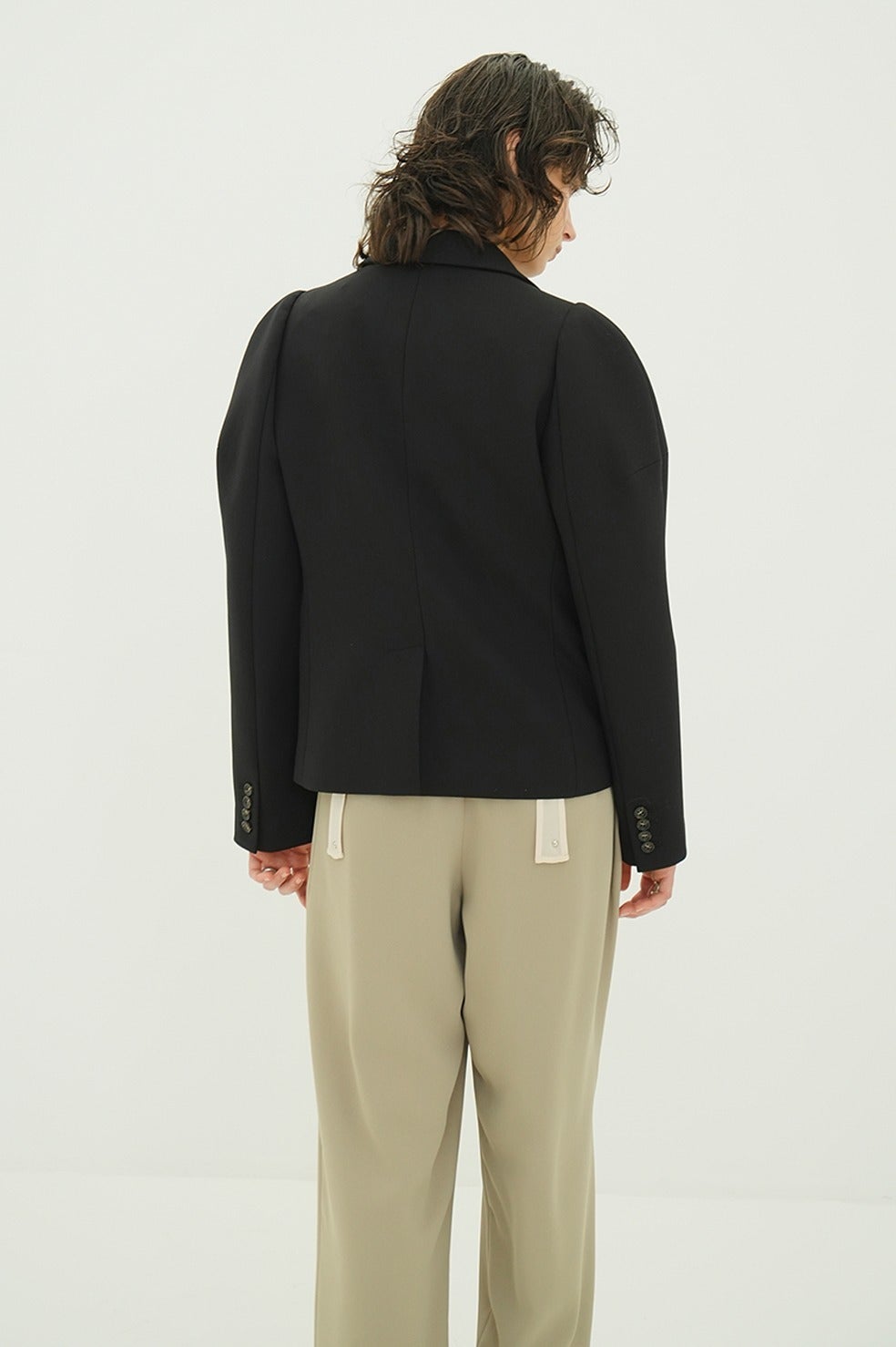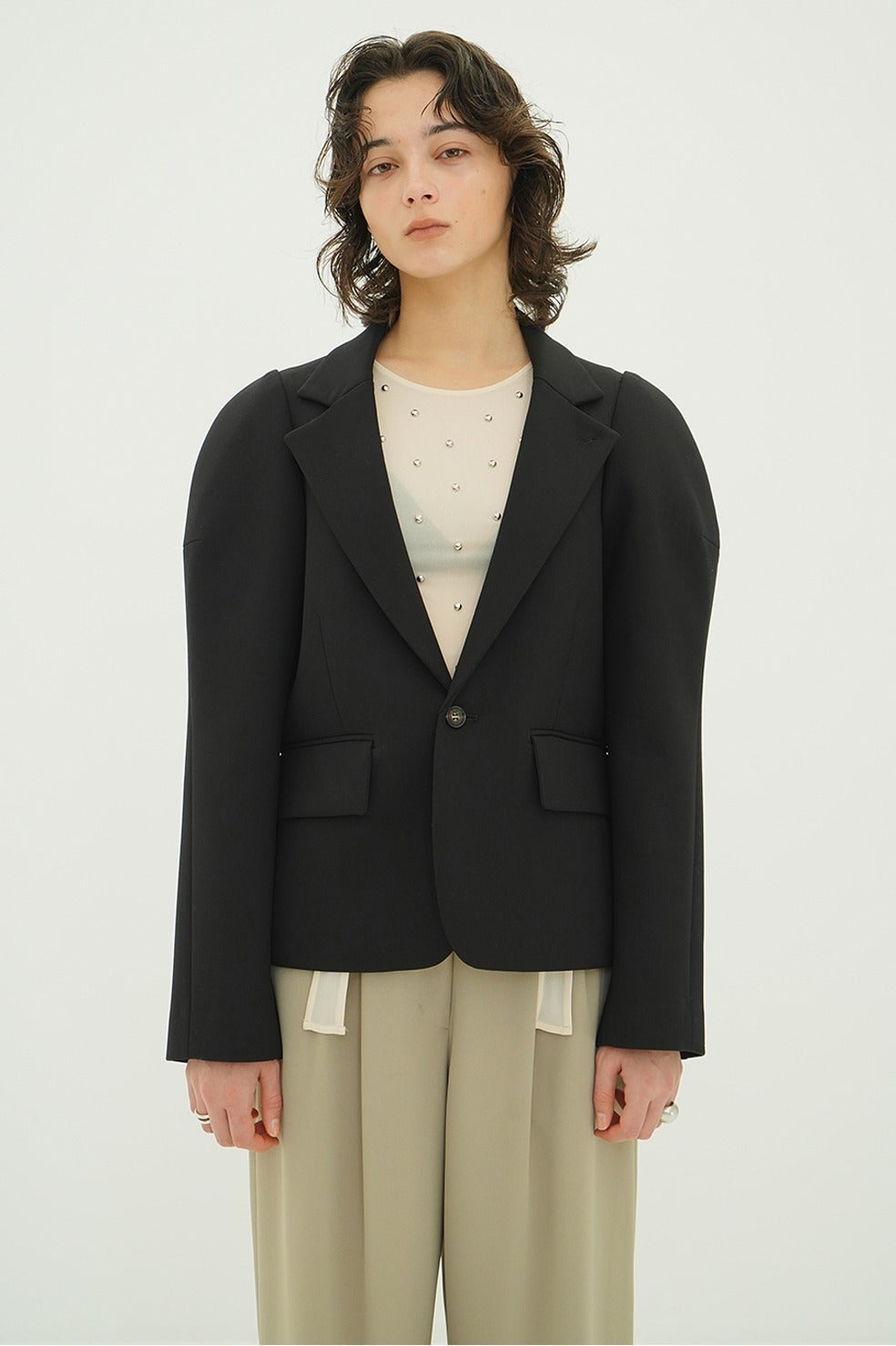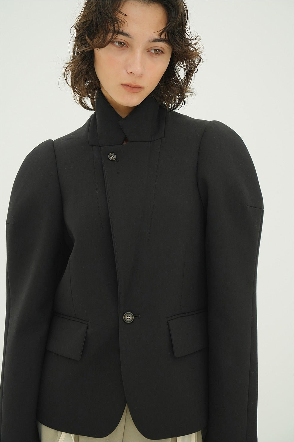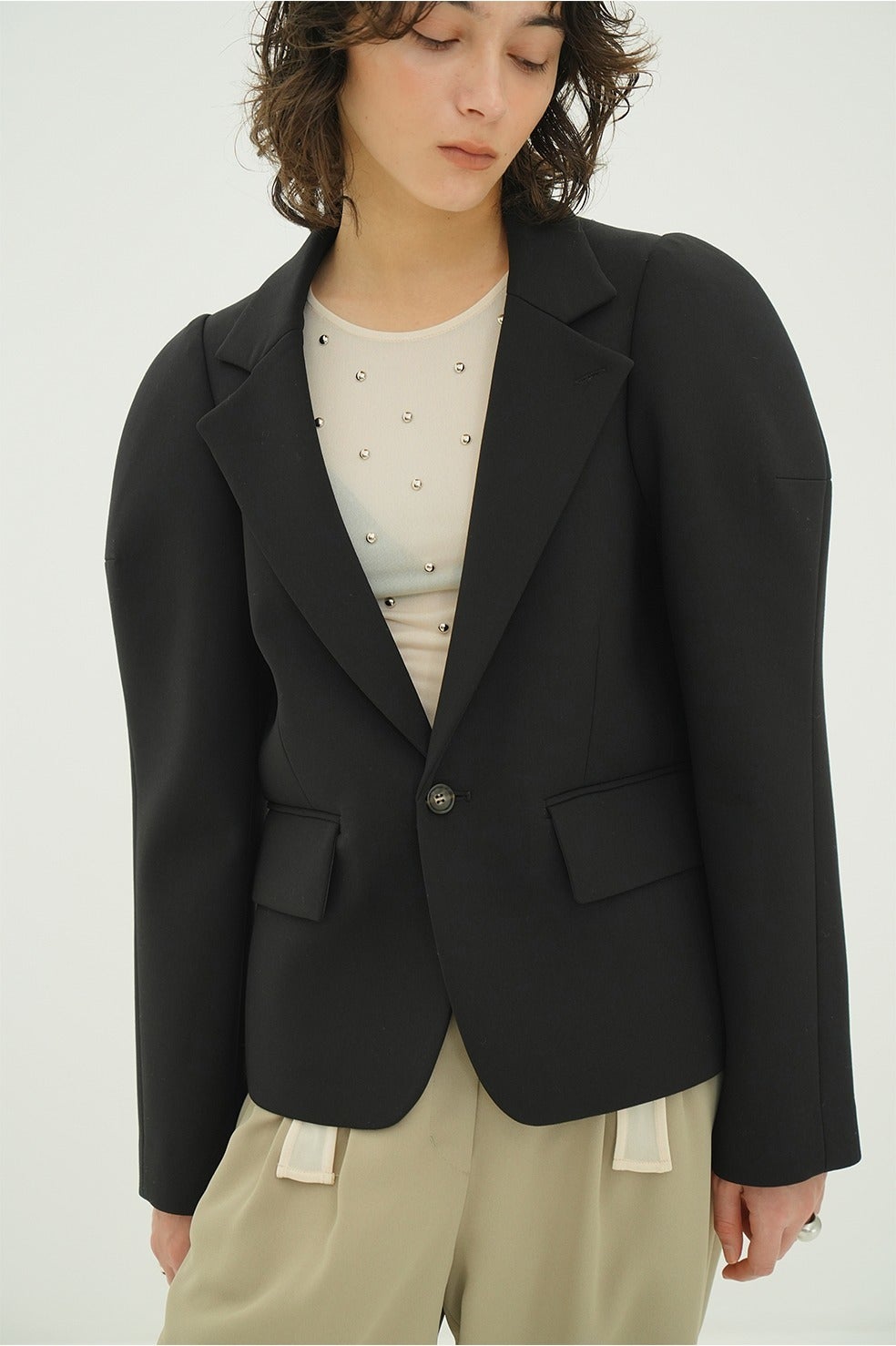 構築的なパフスリーブシルエットが印象的なテーラードジャケット。