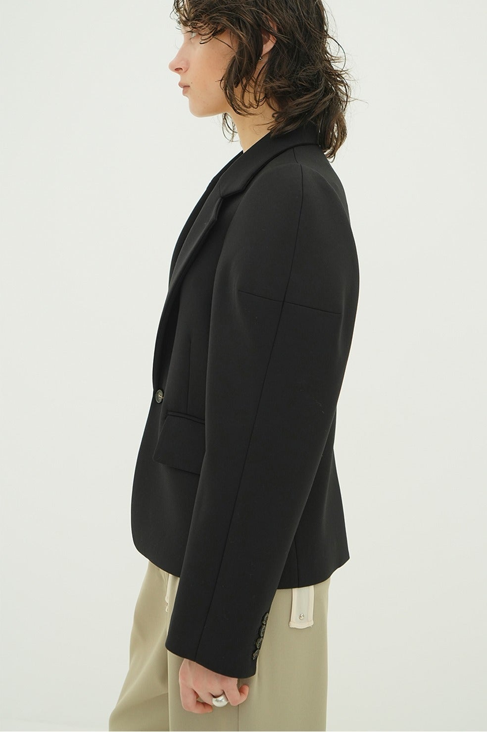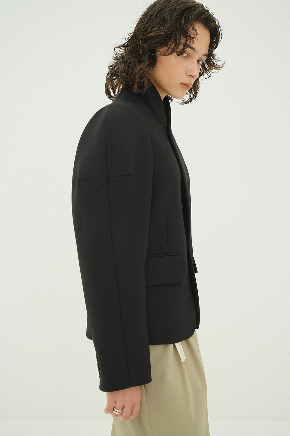 コンパクトでタイトすぎないボディラインと、立体的なショルダーがシンプルながら存在感のある一着です。梳毛タイプのギャバ素材にボンディング加工を施し、美しいフォルムを実現しました。