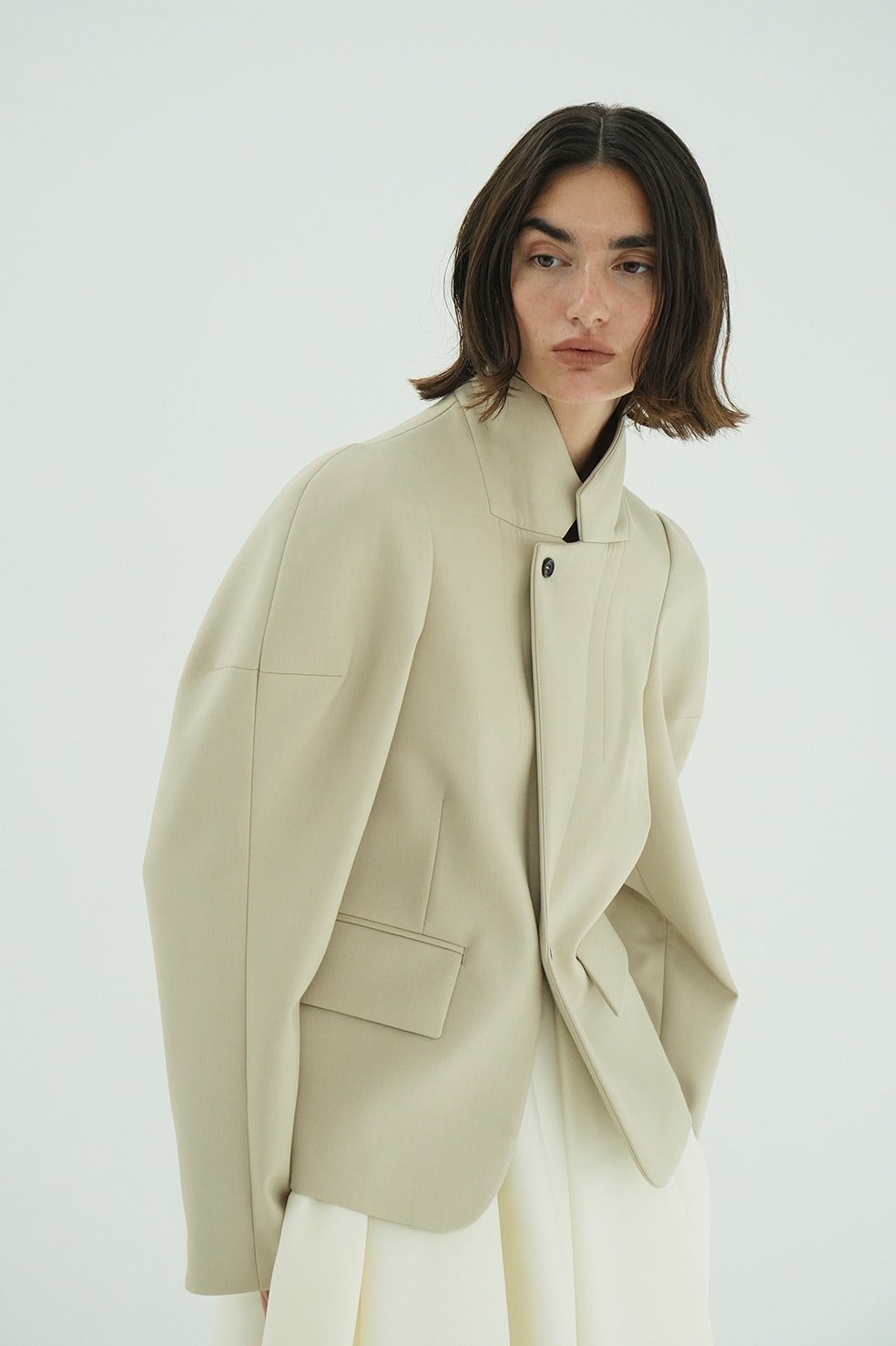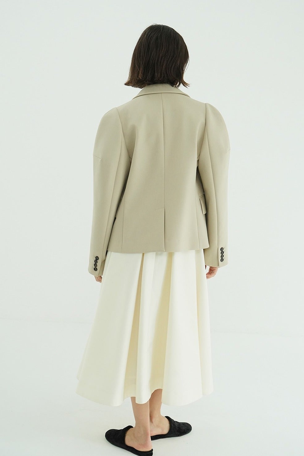 コンパクトでタイトすぎないボディラインと、立体的なショルダーがシンプルながら存在感のある一着です。梳毛タイプのギャバ素材にボンディング加工を施し、美しいフォルムを実現しました。