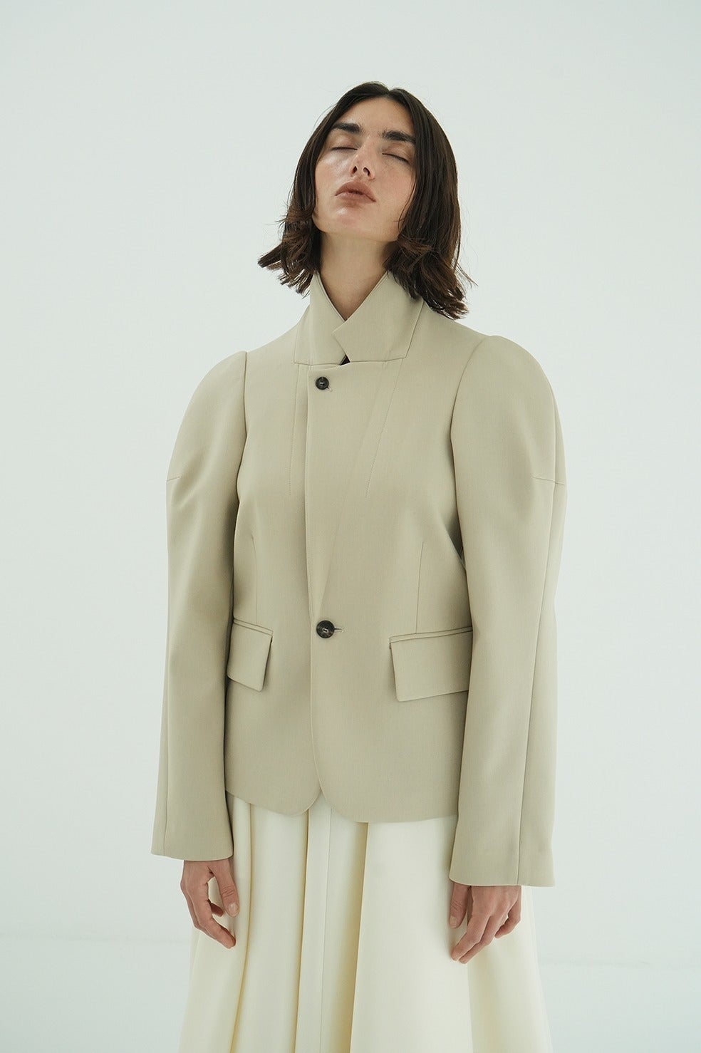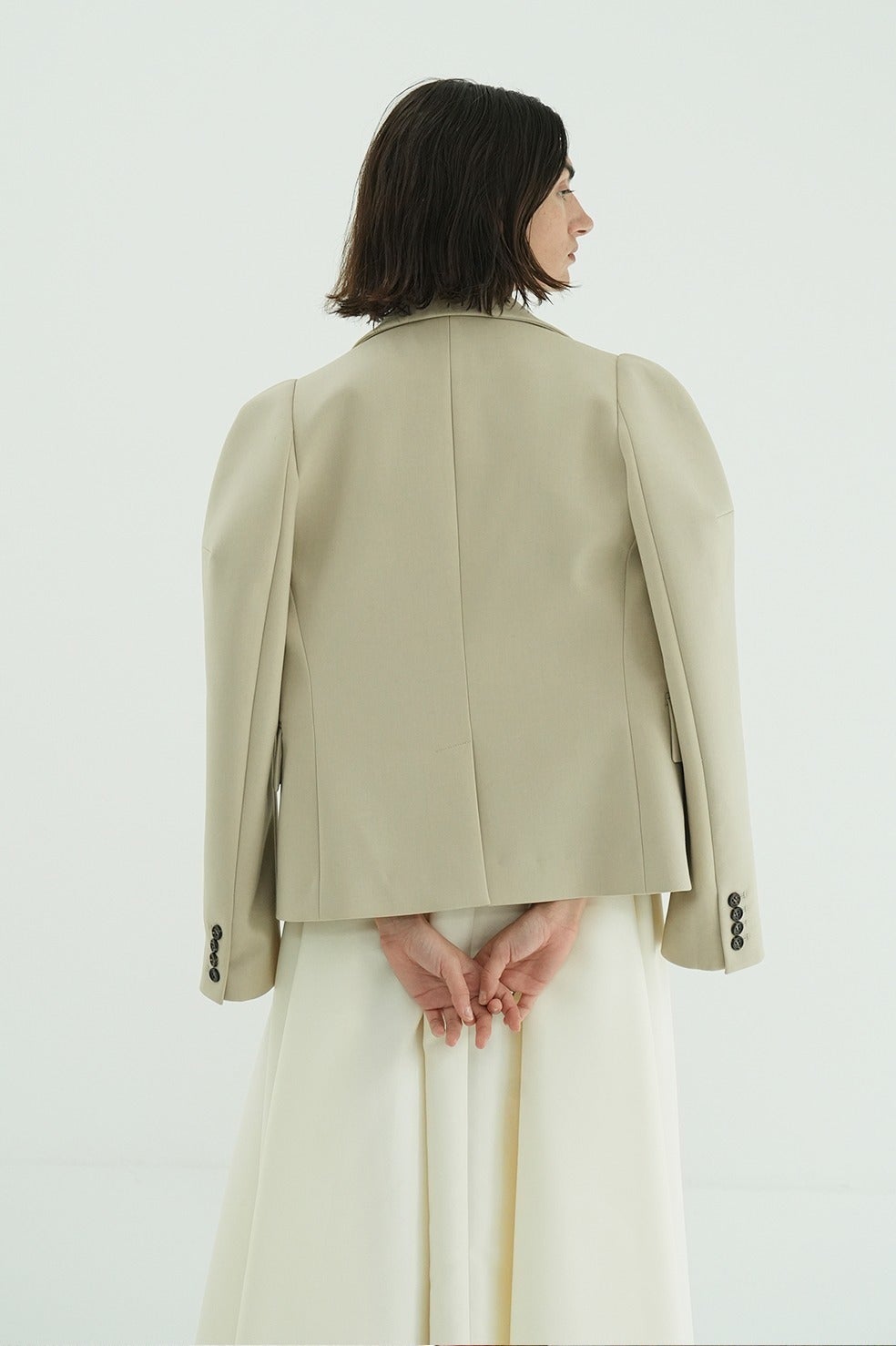 構築的なパフスリーブシルエットが印象的なテーラードジャケット。