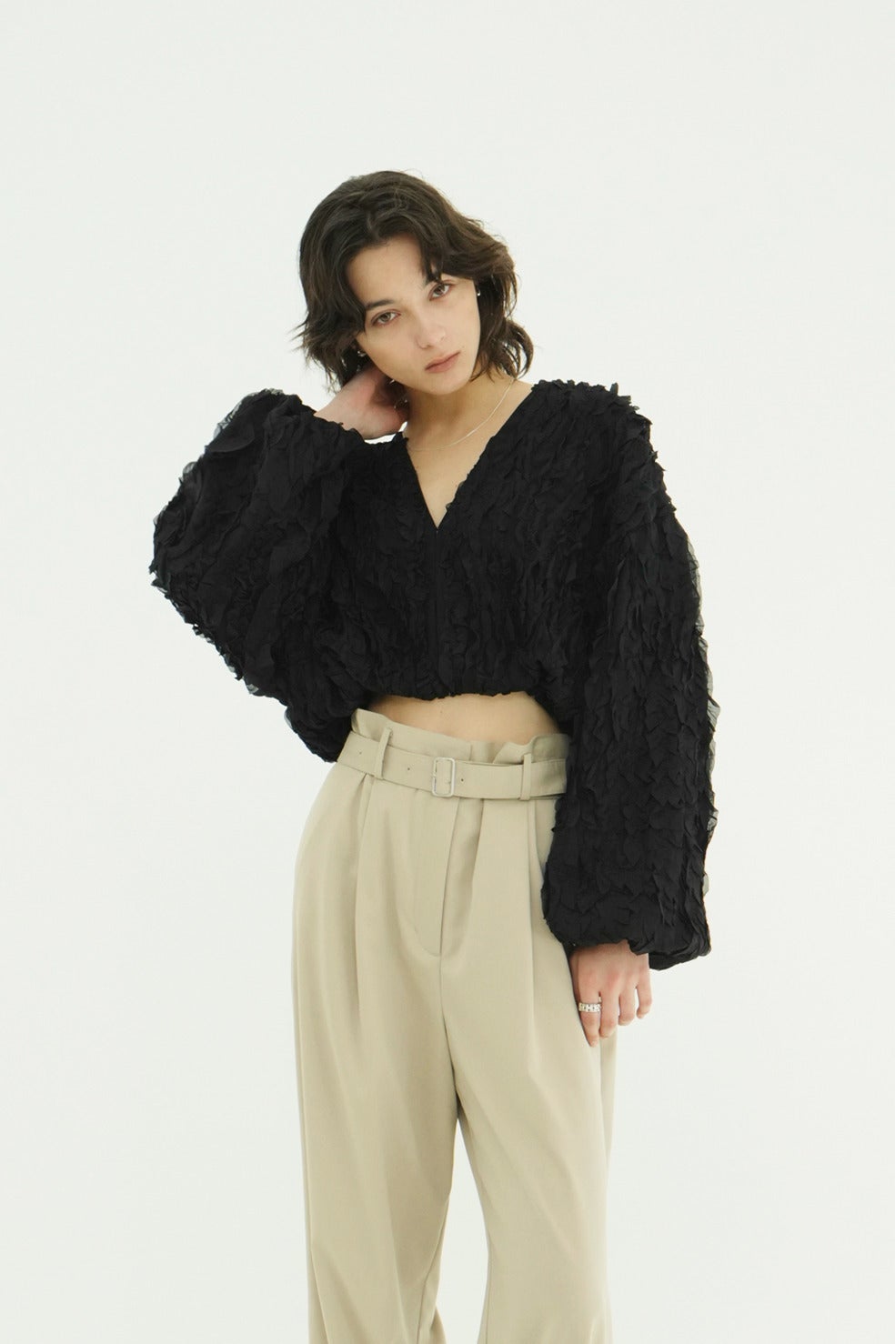 表情感のあるほのかなシアー素材に、程よいハリのあるフリルを太番手であしらったボレロ。