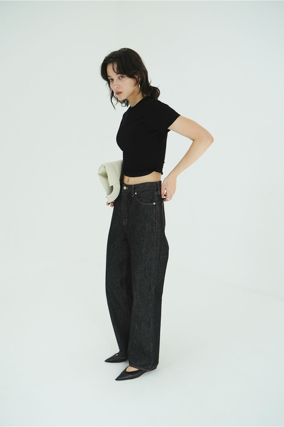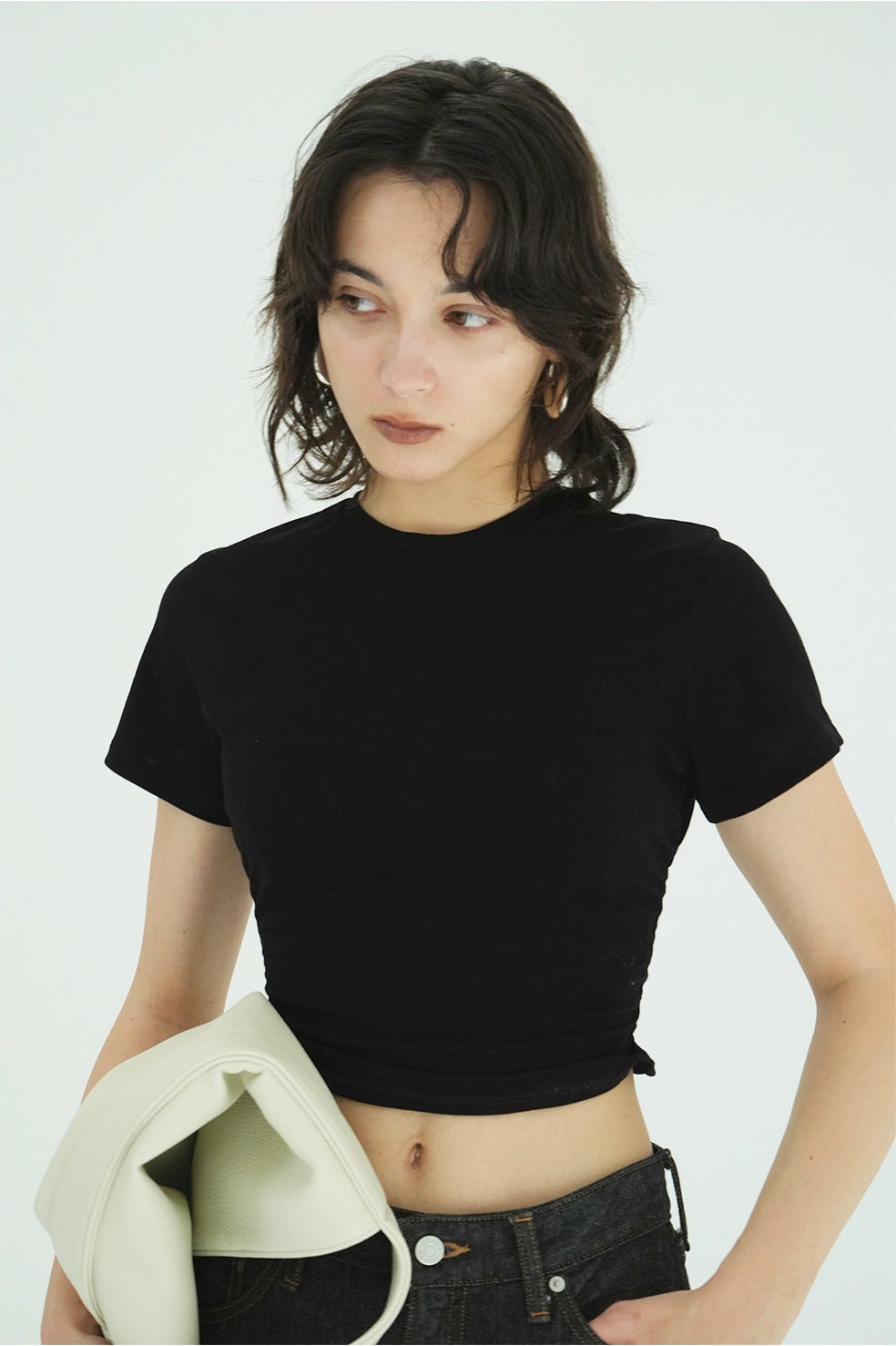 サイドのシャーリングデザインが女性らしいニュアンスをプラスし、一枚で存在感のあるTシャツ。